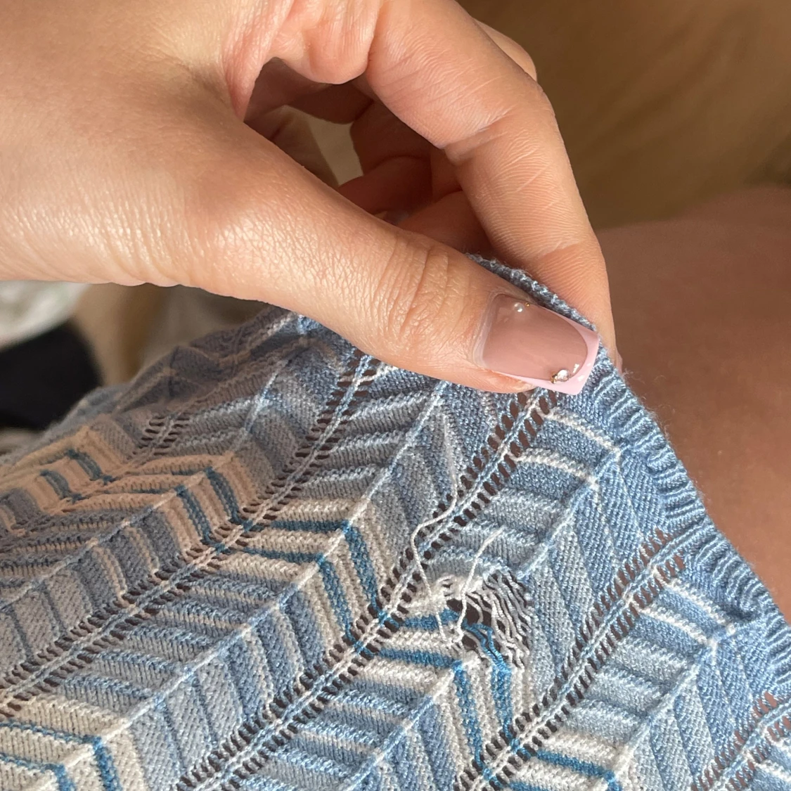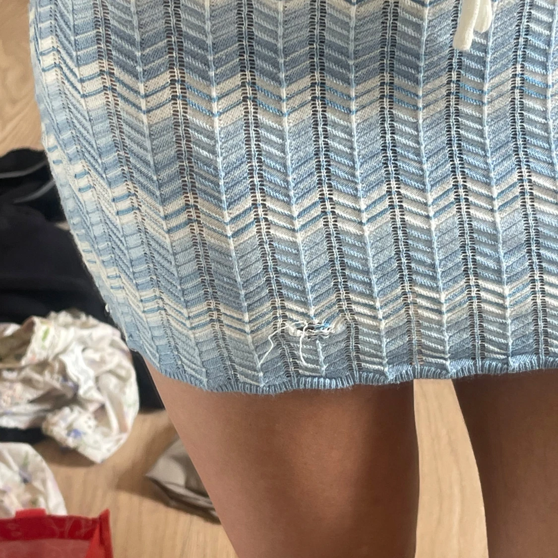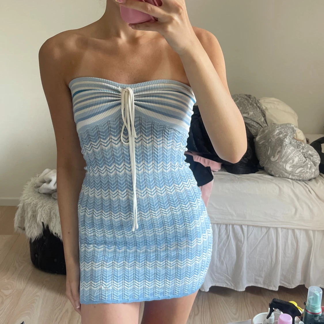 Supersöt stickad kortklänning i blått och vitt med zigzag-mönster. Klänningen är axelbandslös med snörning framtill som kan knytas runt halsen eller hänga ner. Tight passform och perfekt för sommarens varma dagar. från bershka strl M, den har ett hål (se bild) men syns inte på utan bara om man kollar nära
