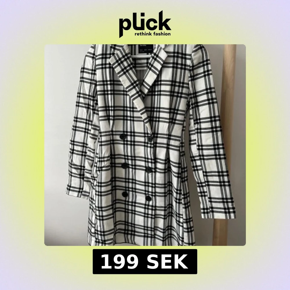Den här klänningen är en stilren och modern blazerklänning från märket Bershka. Blazerklänning med dubbelknäppning (double-breasted) framtill. Färg och mönster: Vit bas med ett klassiskt svart rutigt mönster (typiskt tartan- eller rutigt inspirerat). Krage: Klassisk kavajkrage med slag. Ärmar: Långa ärmar, raka. Stil: Den har ett strukturerat, skräddarsytt utseende som gör att den passar både som klänning och som lång blazer/kavaj.
