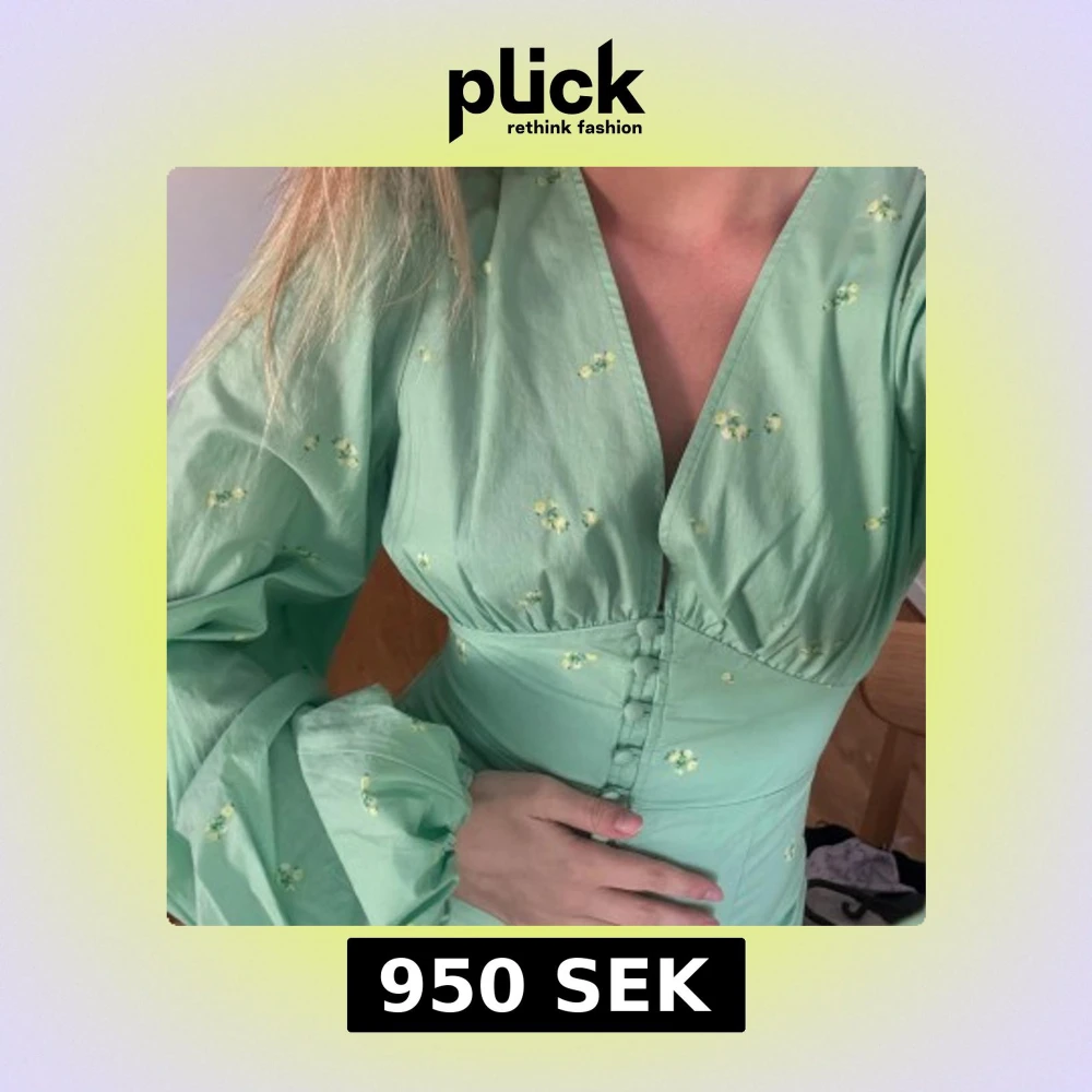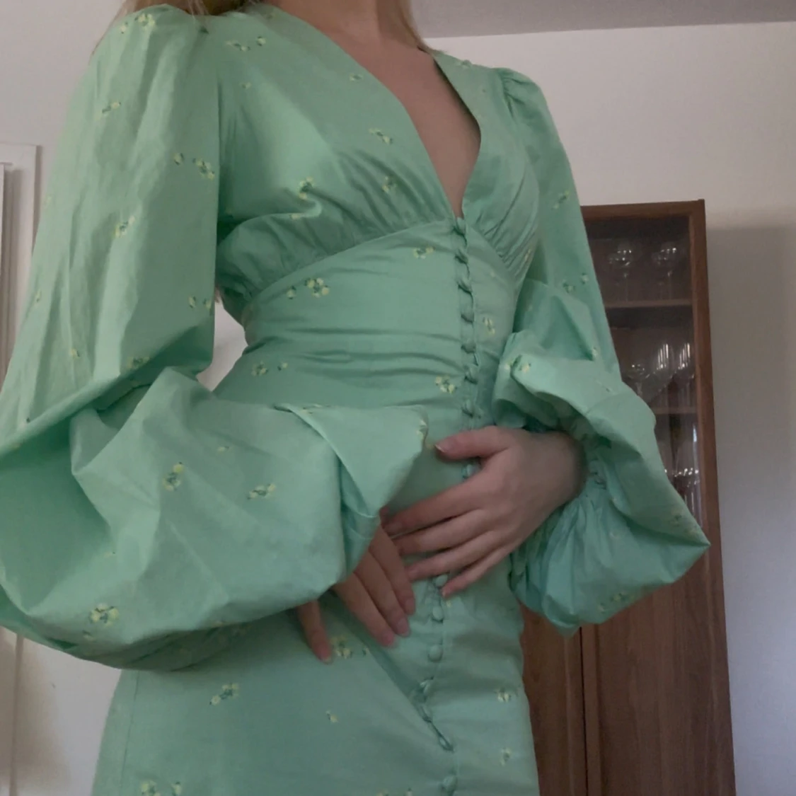 Superfin mintgrön klänning med små gula blommor, djup v-ringning och markerad midja. Klänningen har långa puffärmar och knappar framtill. Perfekt för vår och sommar! Storlek 34.
