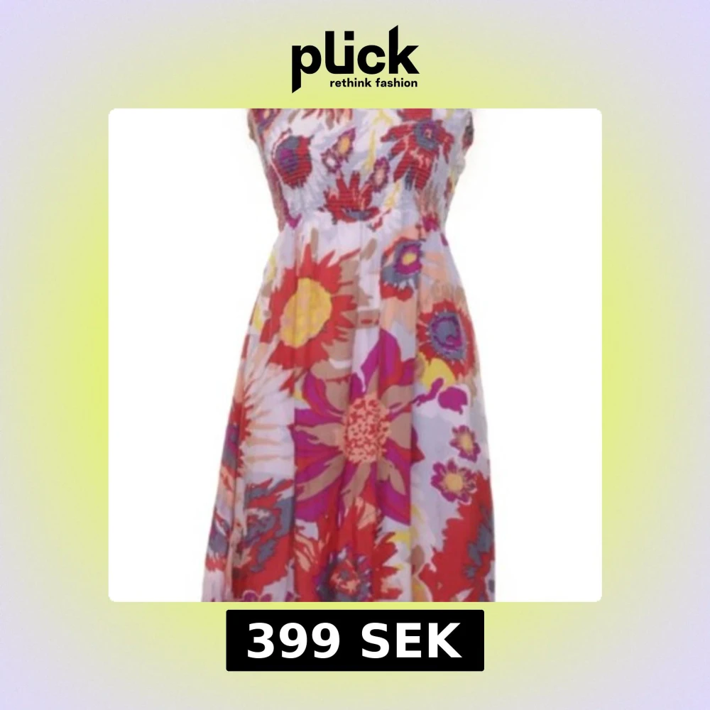 Säljer en färgglad axelbandslös klänning med blommigt mönster i rött, rosa, gult och lila. Klänningen har en smockad överdel och volangdetaljer nedtill. Perfekt för sommarens varma dagar! Mycket bra material kvalitet. L ca. 90 cm.