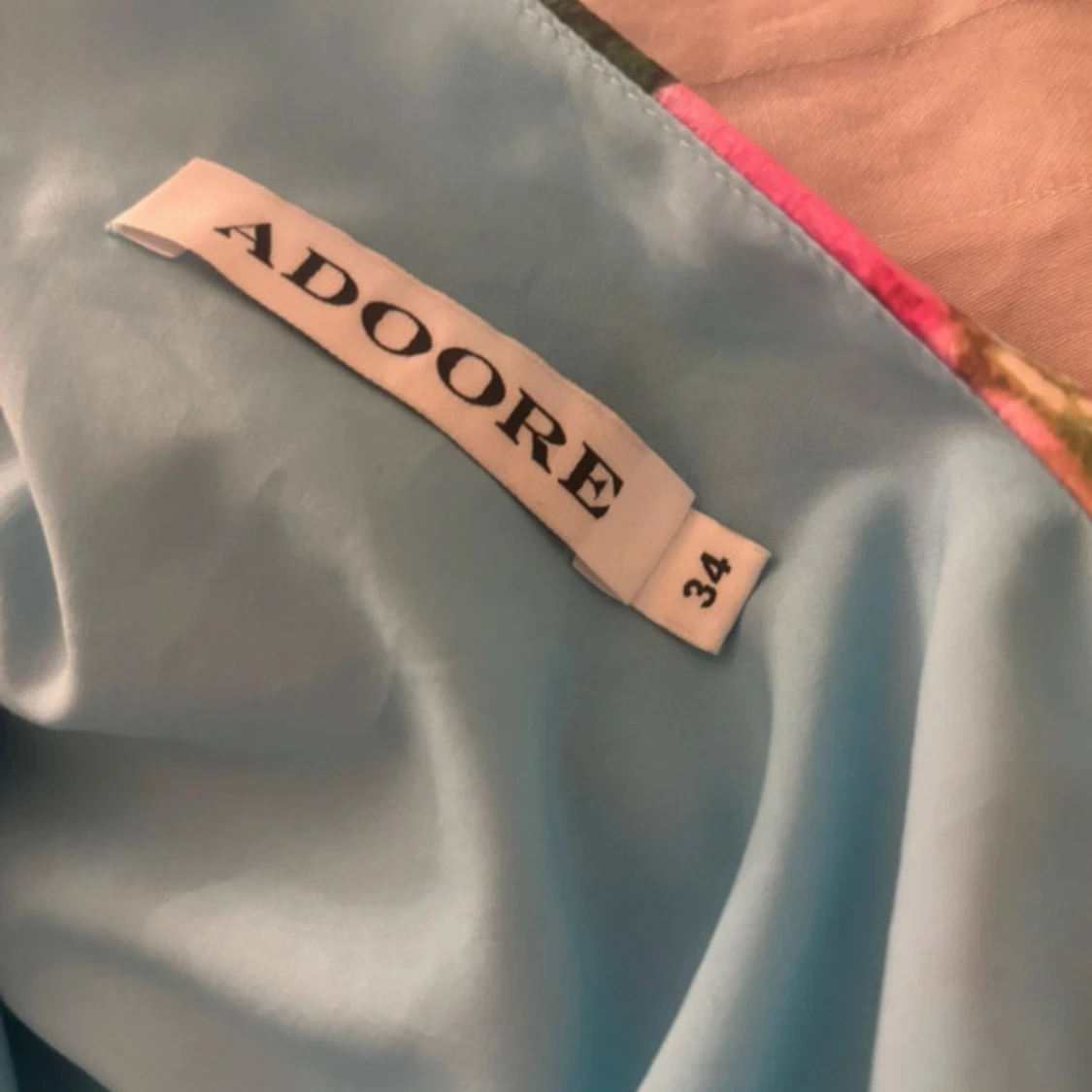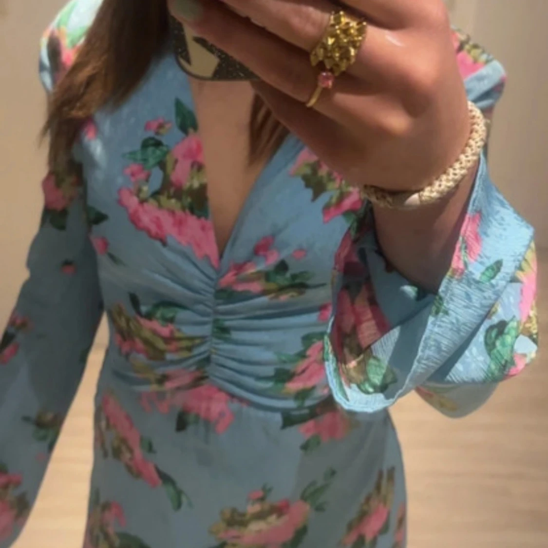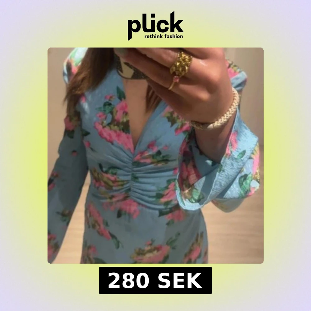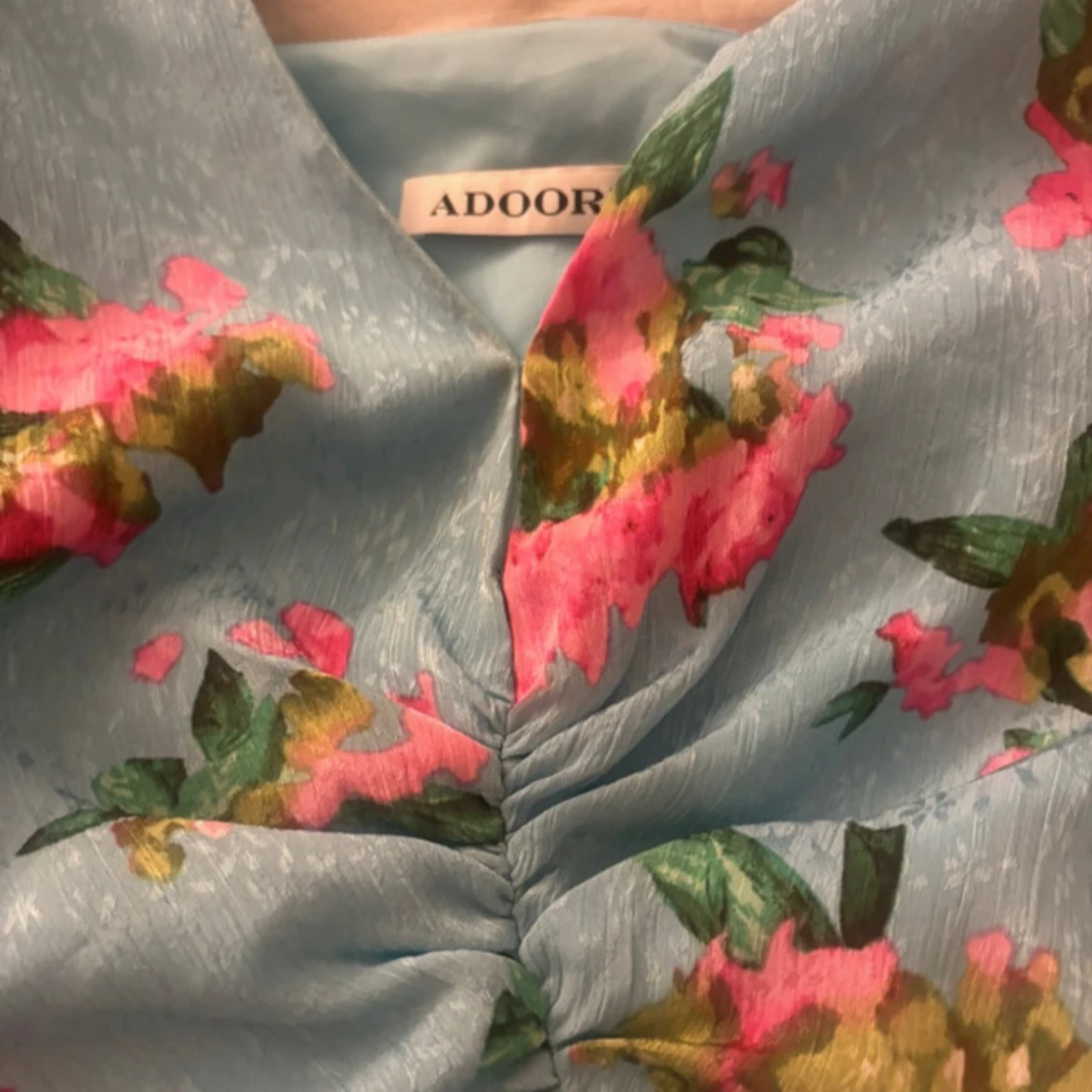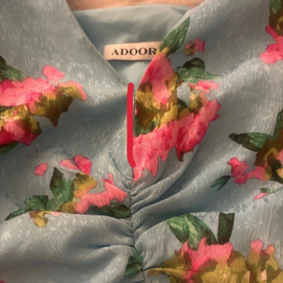 Supersöt blå klänning från Adoore med blommigt mönster i rosa och grönt. Djup v-ringning, rynkade detaljer framtill och långa ärmar med lätt utsvängd form. Perfekt för dig som vill sticka ut med en romantisk vibe. Ihopsydd vid det röda strecket då jag ej kände mig bekväm med urringat. Skriv för mer bilder💞