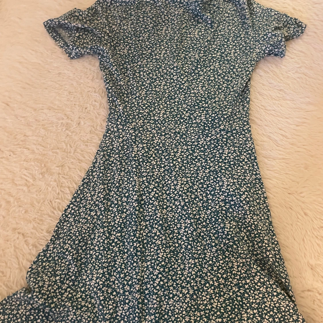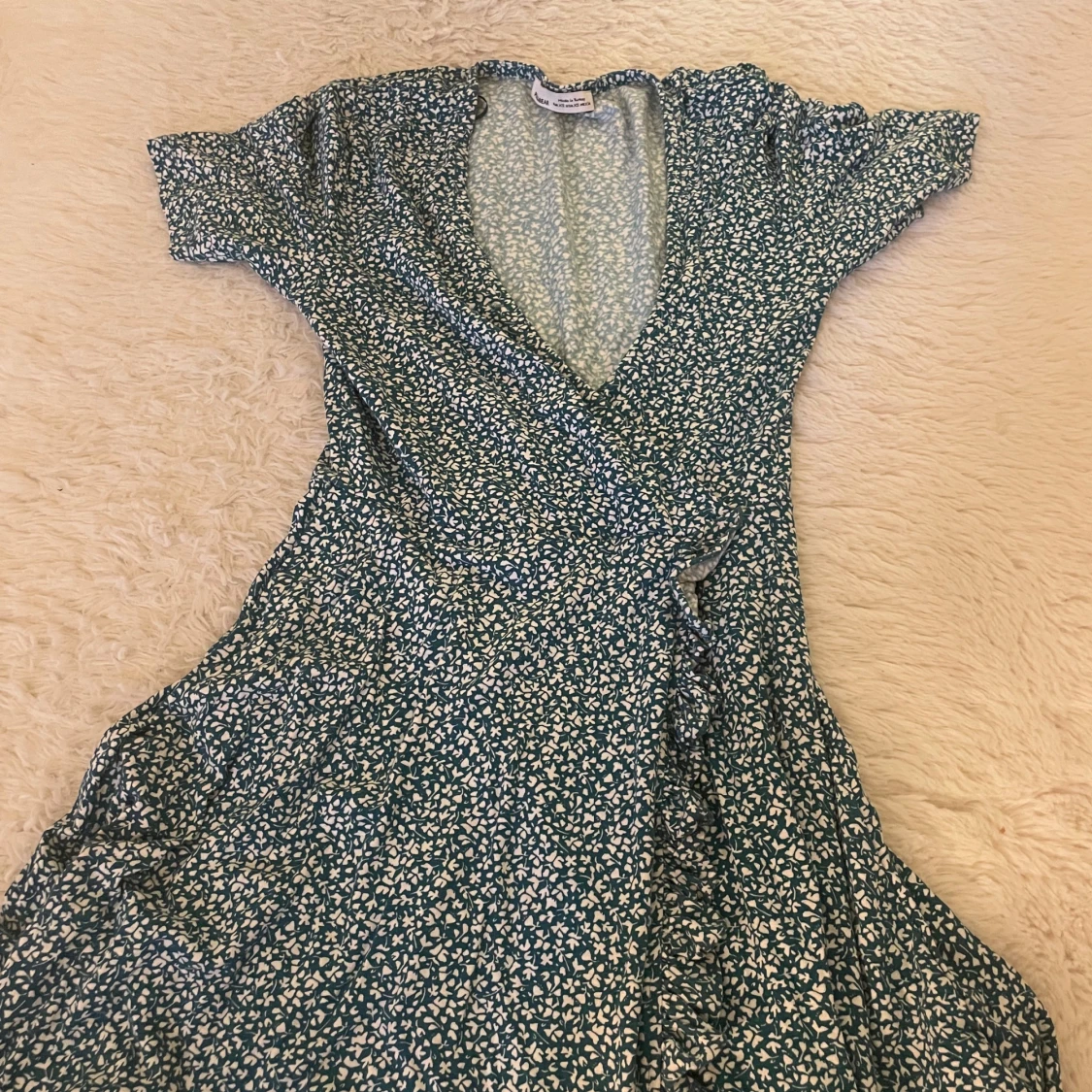 Supersöt långklänning från Pull&Bear i blått med vitt blommigt mönster. Klänningen har omlottmodell med v-ringning och korta ärmar. Perfekt för dig som gillar en feminin och avslappnad stil. Materialet är mjukt och lätt, troligen bomull eller polyester.
