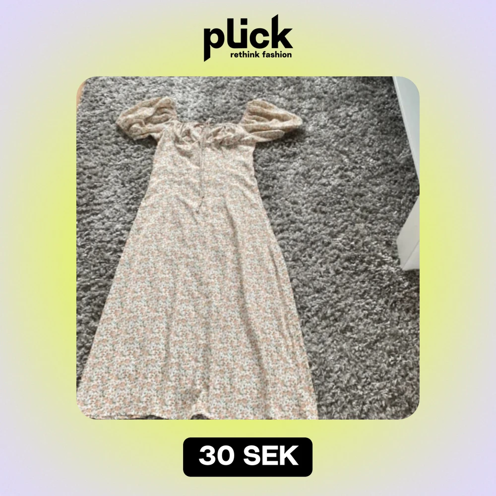 Det är en fin blommig klänning med lite puffärmar. Som är fin o ha på kalas,fäster,mm den är i bra skick har använts några gånger🤍💚🧡
