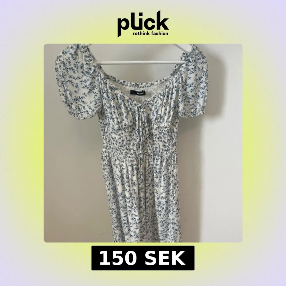 Charmig blommig klänning från Lager 157 i vitt med blått mönster. Klänningen har korta puffärmar och en söt knytning framtill. Perfekt för en somrig look!