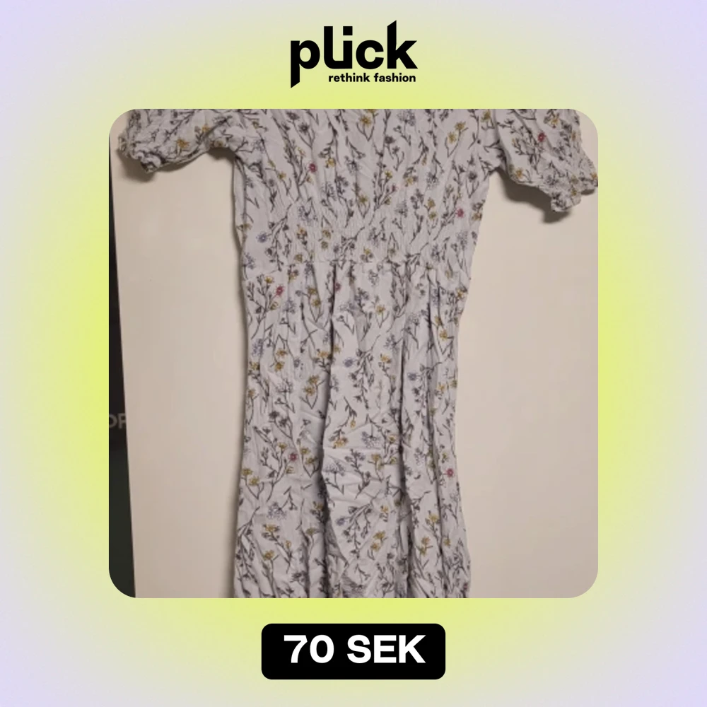 Säljer en superfin blommig klänning i ljus färg. Den har korta ärmar och ett härligt blommönster i olika färger som ger en somrig känsla. Perfekt för vår och sommar! Är använd 1 gång. Priset kan diskuteras