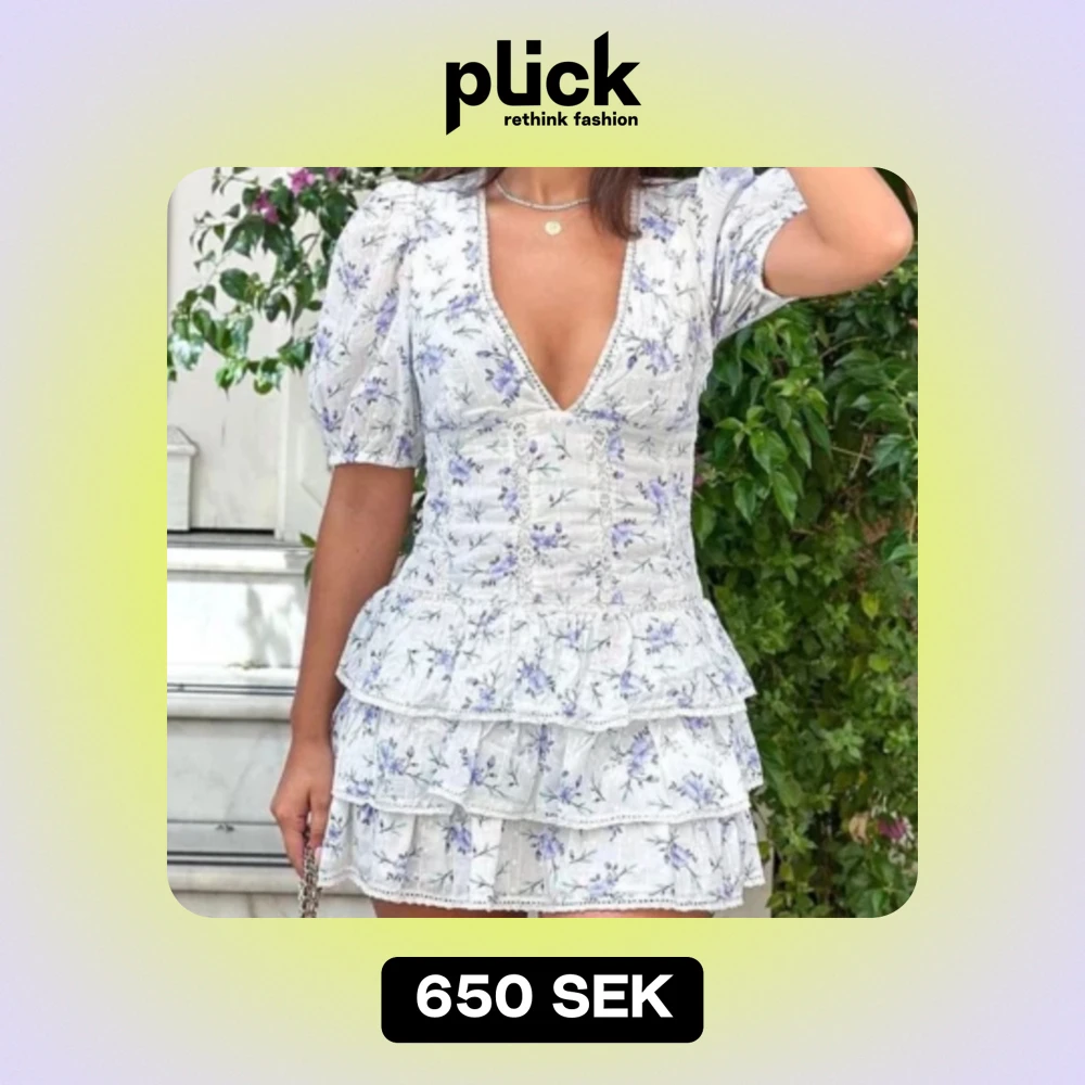 Söt blommig sommarklänning. Klänningen är v-ringad med volang nedtill. Säljer då den va för liten och den är i storlek s. Köpt för 899, säljer för 650 då den aldrig är använd.
