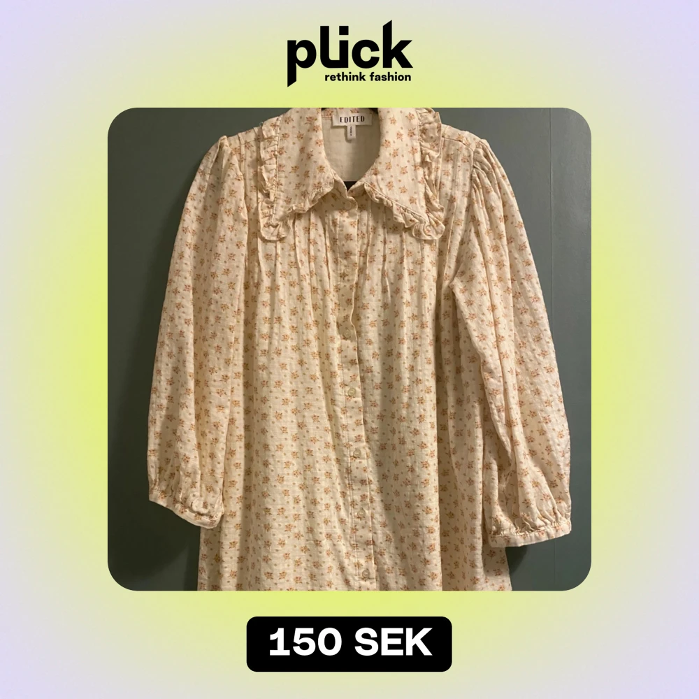 Charmig blommig klänning från Edited i ljusa toner. Den har långa ärmar och en söt volangkrage. Perfekt för vår och sommar med sitt lätta och luftiga material. Använt bara några gånger!