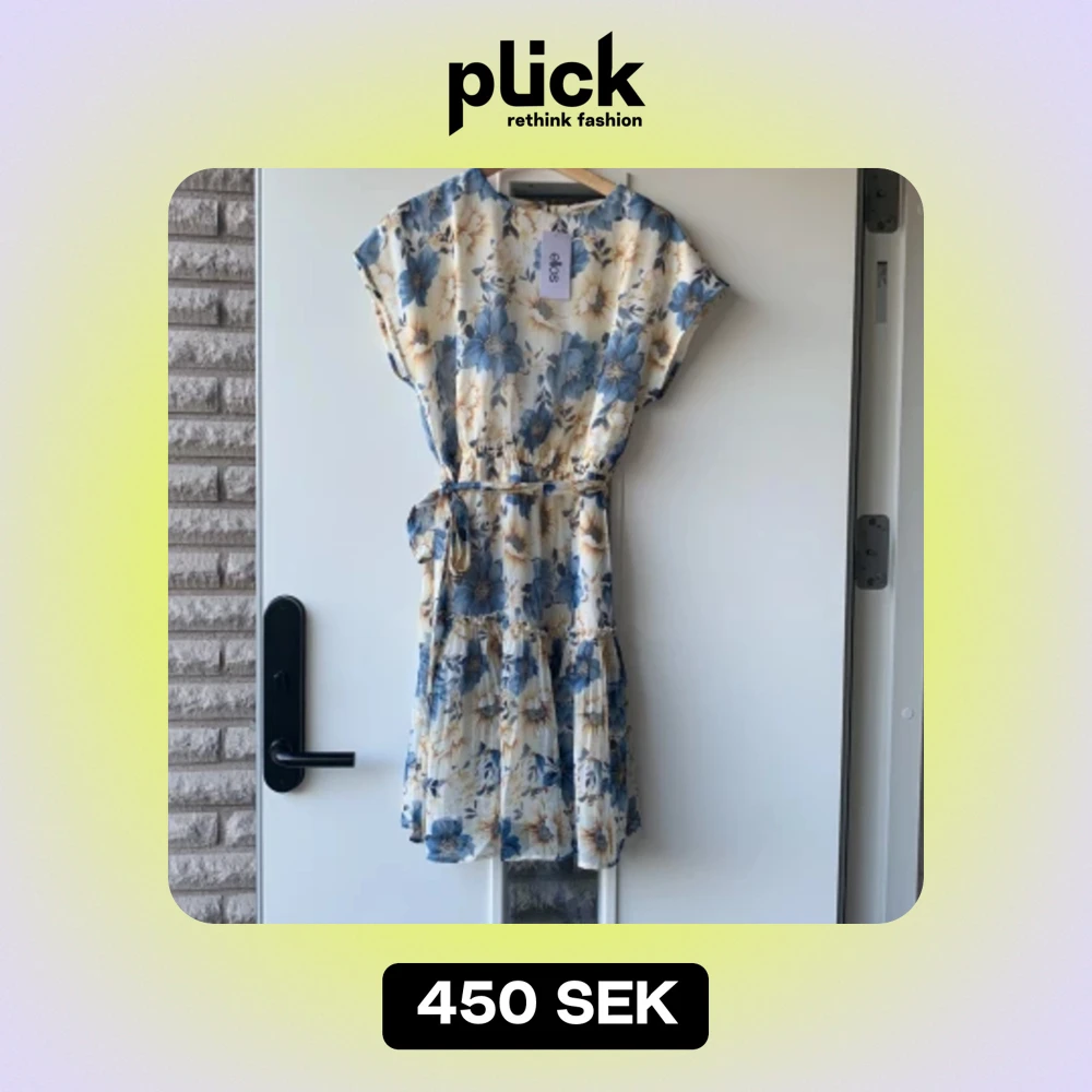 Säljer en superfin blommig klänning från Ellos i storlek 38/40. Den har ett vackert blommönster i blått och beige på en ljus bakgrund. Klänningen är kortärmad och har en knytning i midjan för en smickrande passform. Perfekt för sommarens alla fester eller en dag på stan!