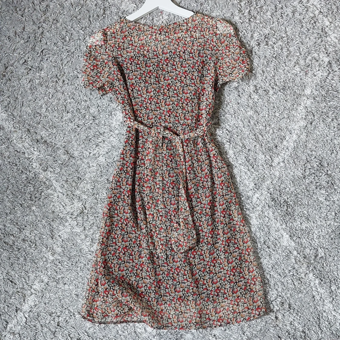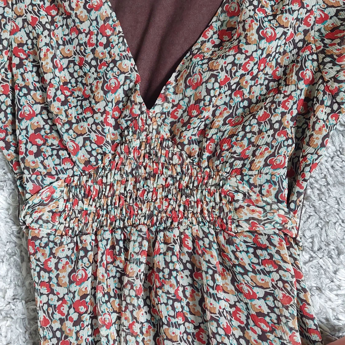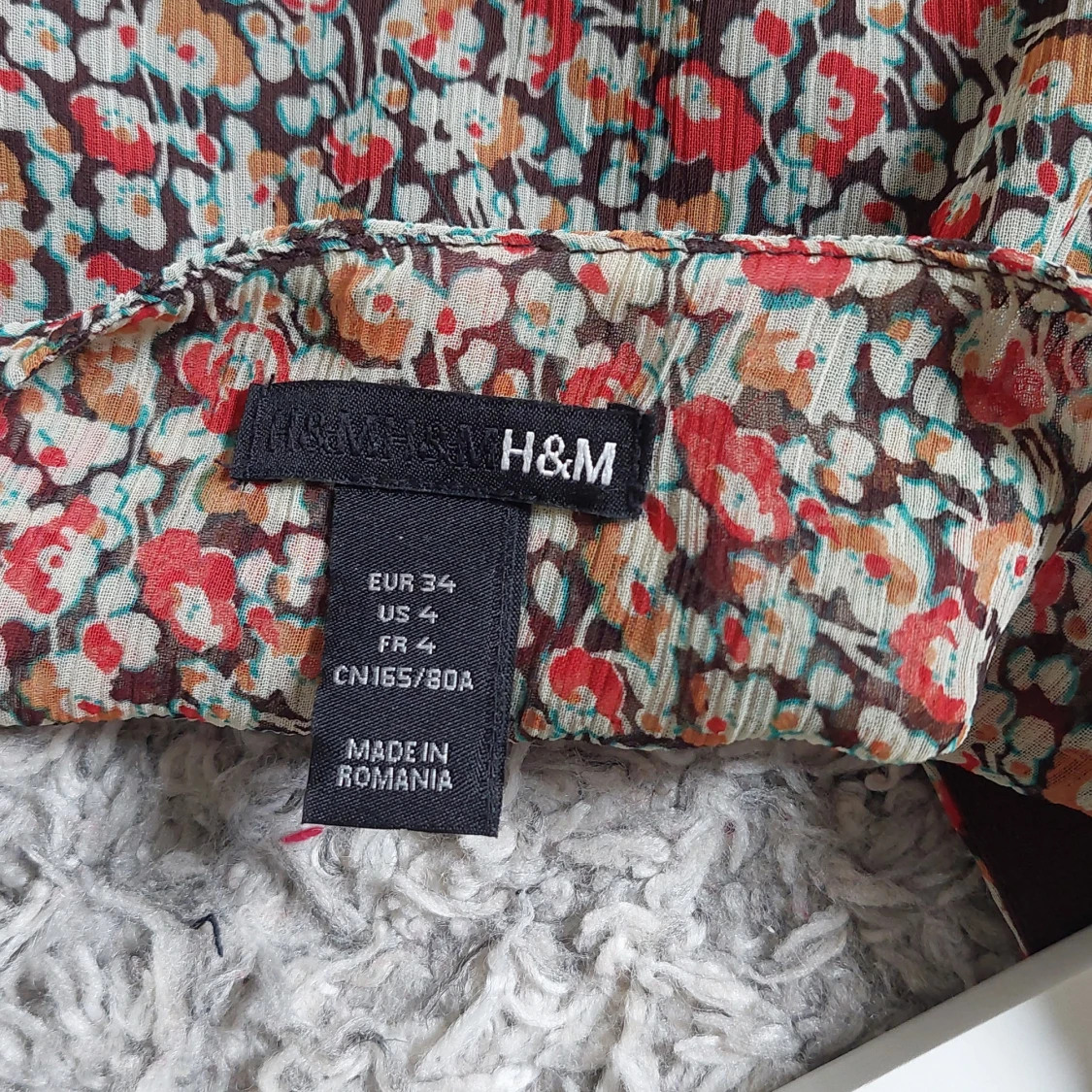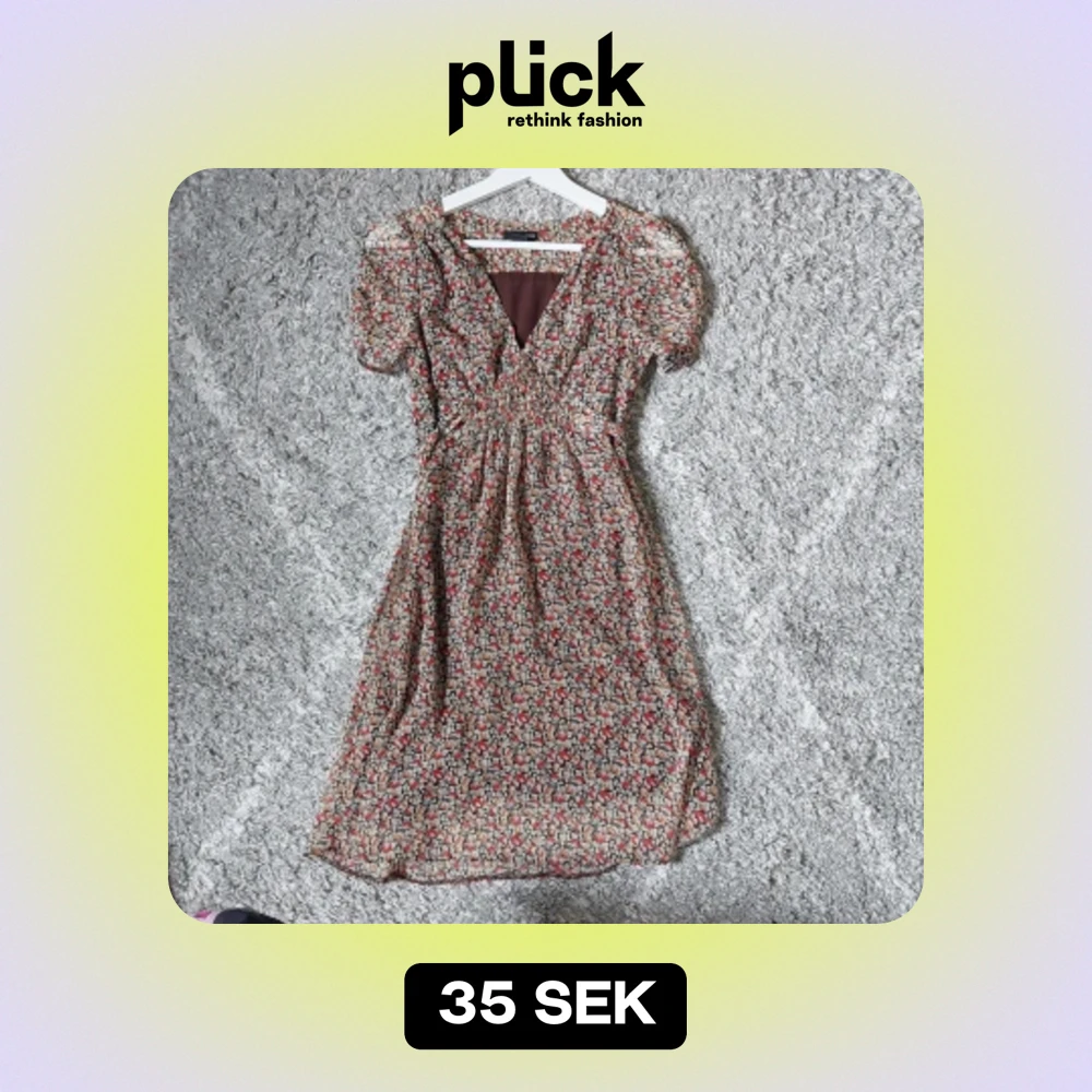 En blommig klänning från H&M i storlek XS. Klänningen har korta ärmar och en v-ringad hals. Justerbar storlke tackvare ett elastiskt midjeband och knytband i ryggen. Använd ca 1 gång och säljer då den är för liten för mig.