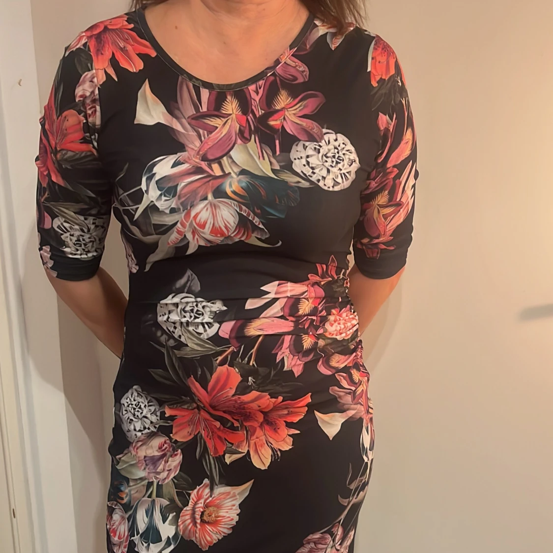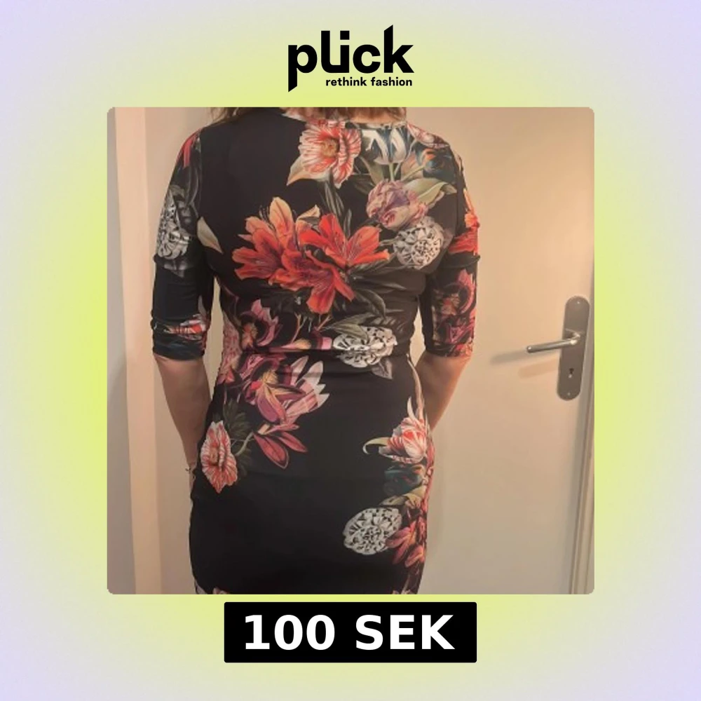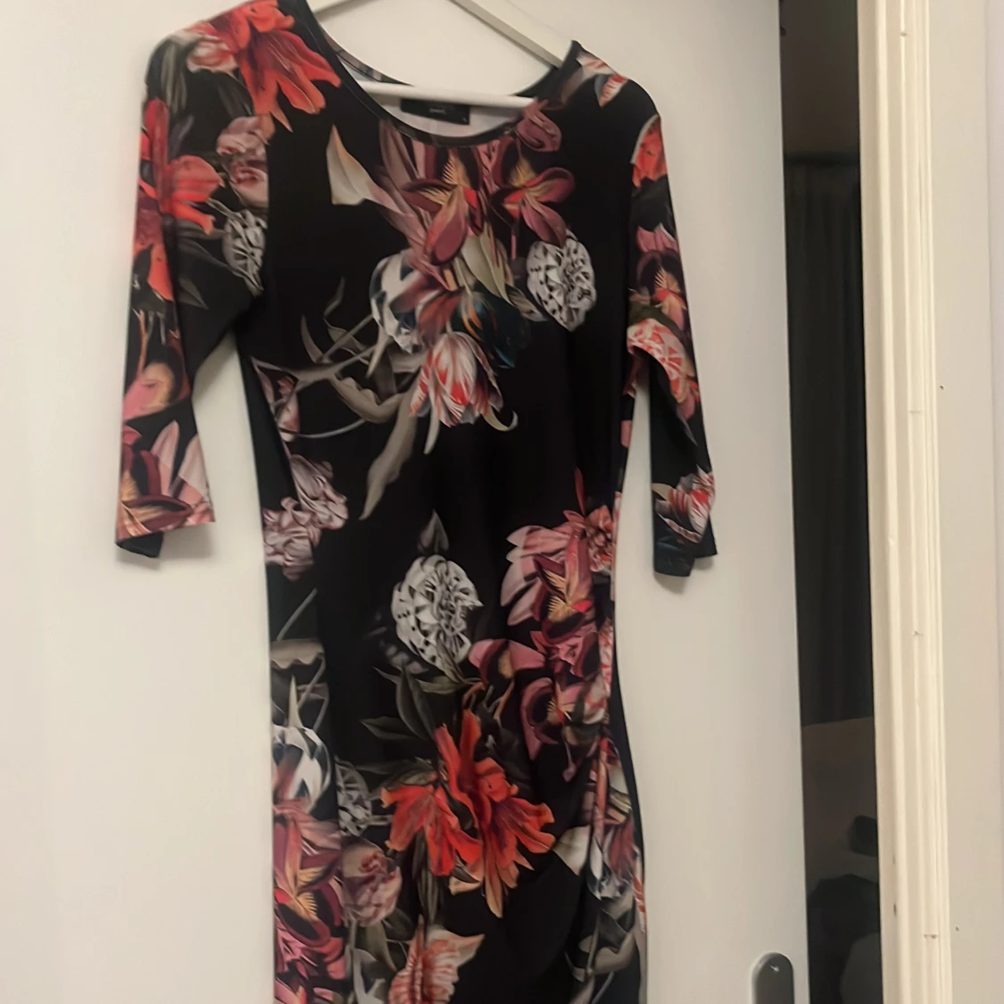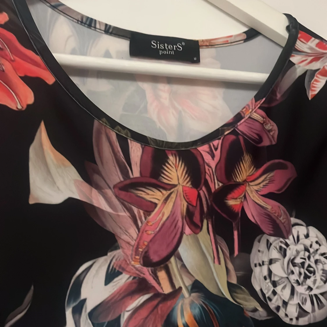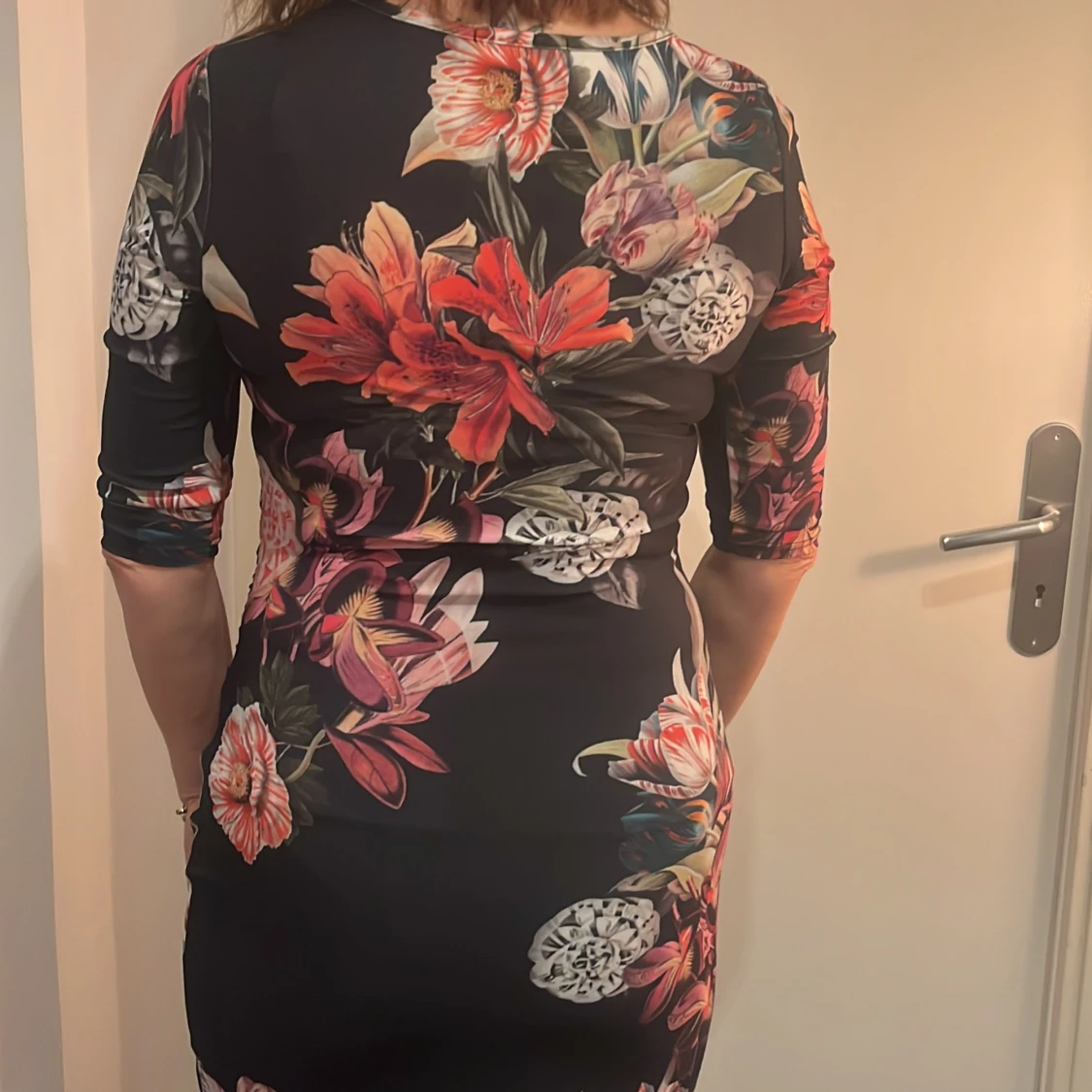 Snygg blommig klänning från Sisters Point med trekvartsärmar och en figurnära passform. Klänningen har ett färgglatt mönster med stora blommor i rött, rosa och vitt på en svart bakgrund. Perfekt för en färgglad look!