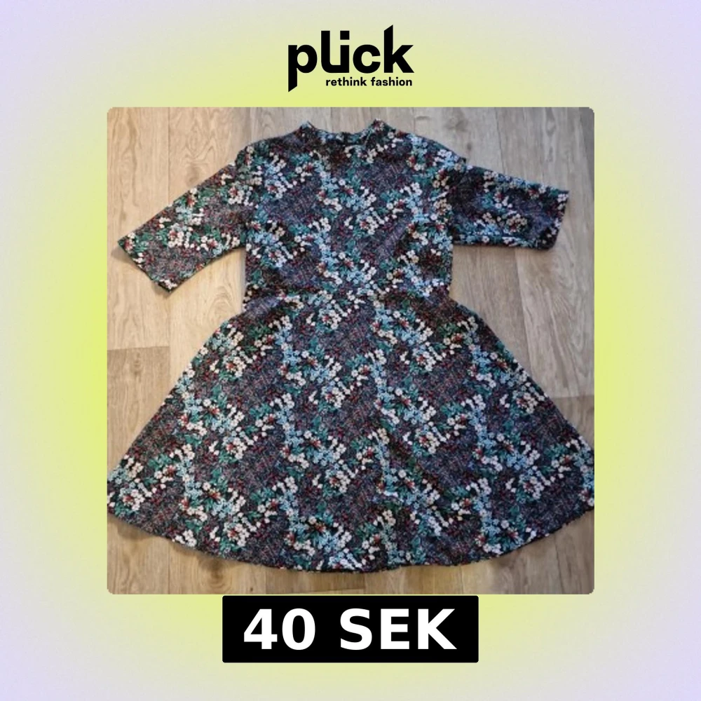 Säljer en blommig klänning från Zara Basic med trekvartsärm och rund halsringning. Klänningen har en utställd kjol och ett färgglatt blommönster i grönt, rött, blått och vitt. Perfekt för dig som gillar färg och mönster!