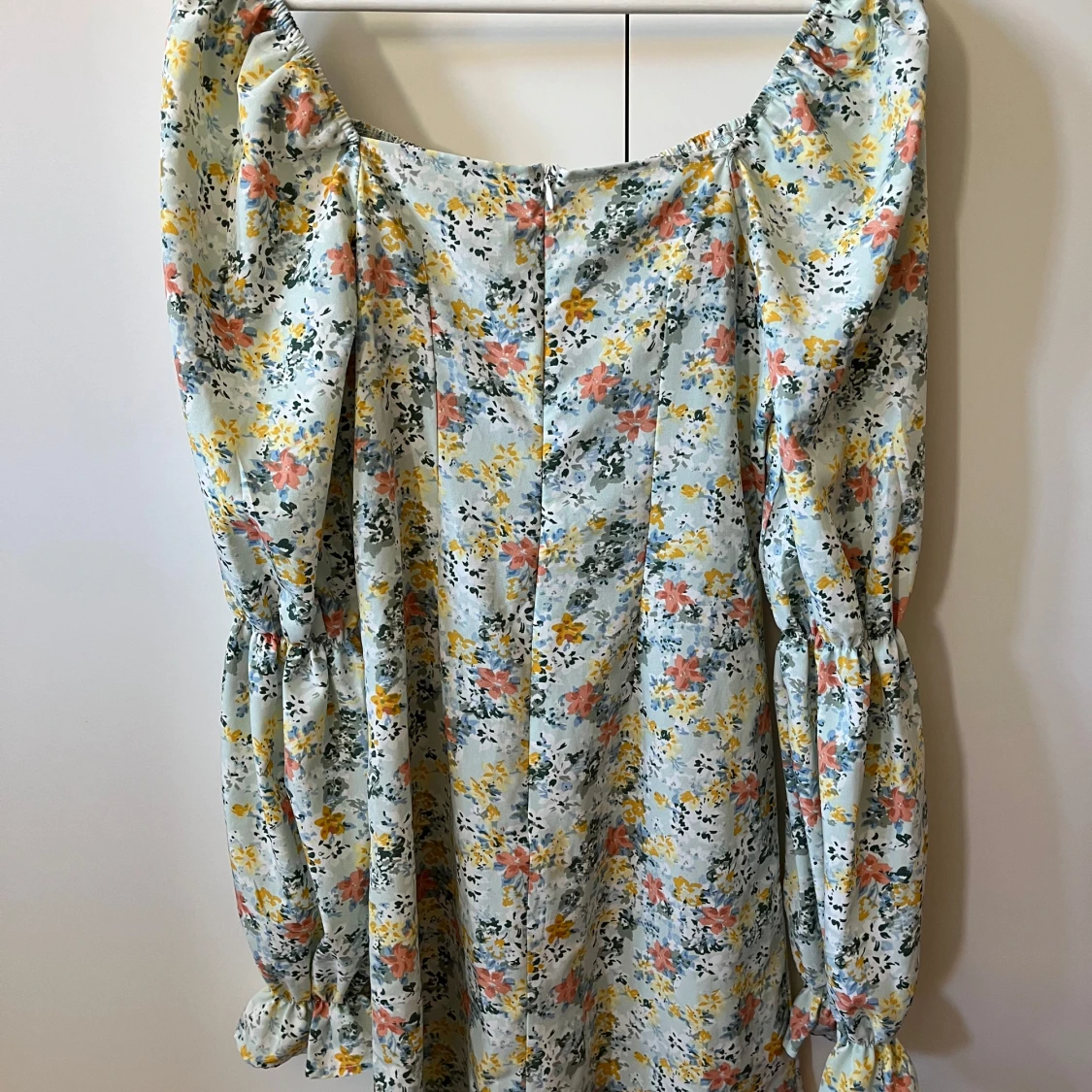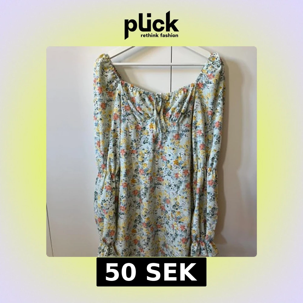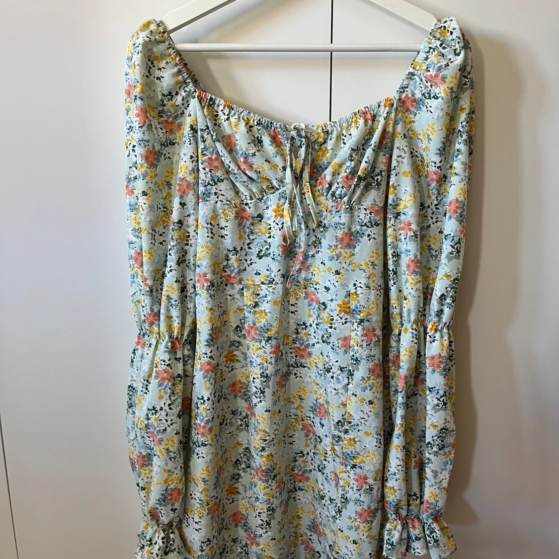 blommig klänning med långa ärmar. Dragkedja i ryggen, och snörning fram till där du kan justera storleken