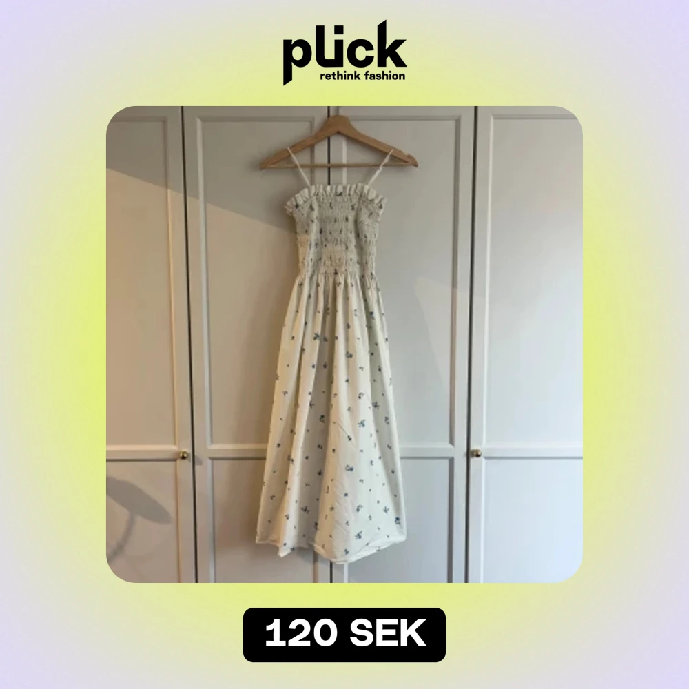 Blåblommig sommarklänning med smock. Avtagbara axelband. 100% bomull. OBS - liten fläck längst ner vid kjolkanten, vid ena sidan. Dock knappt märkbar.
