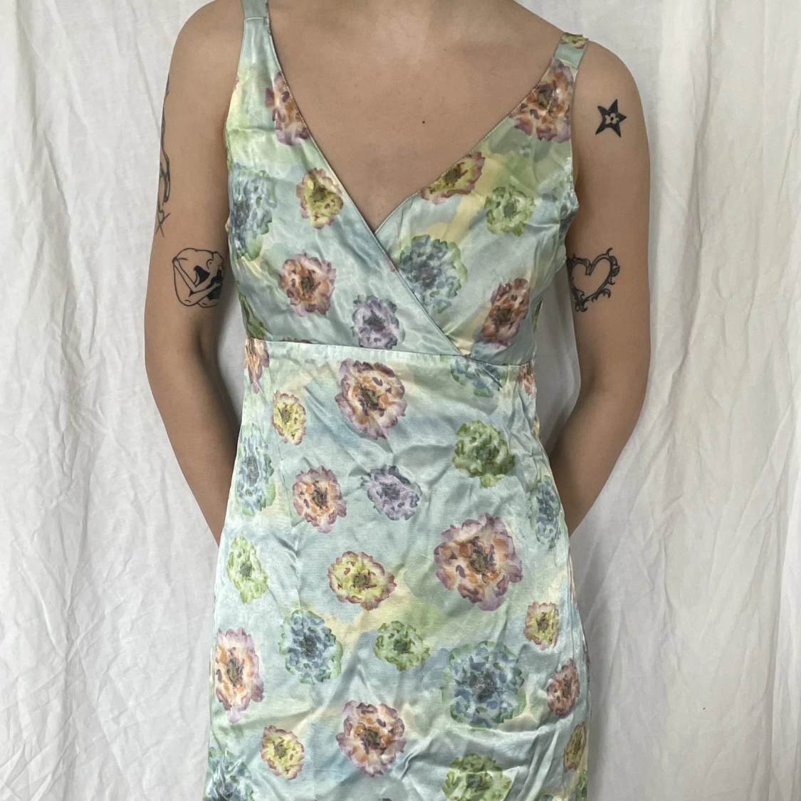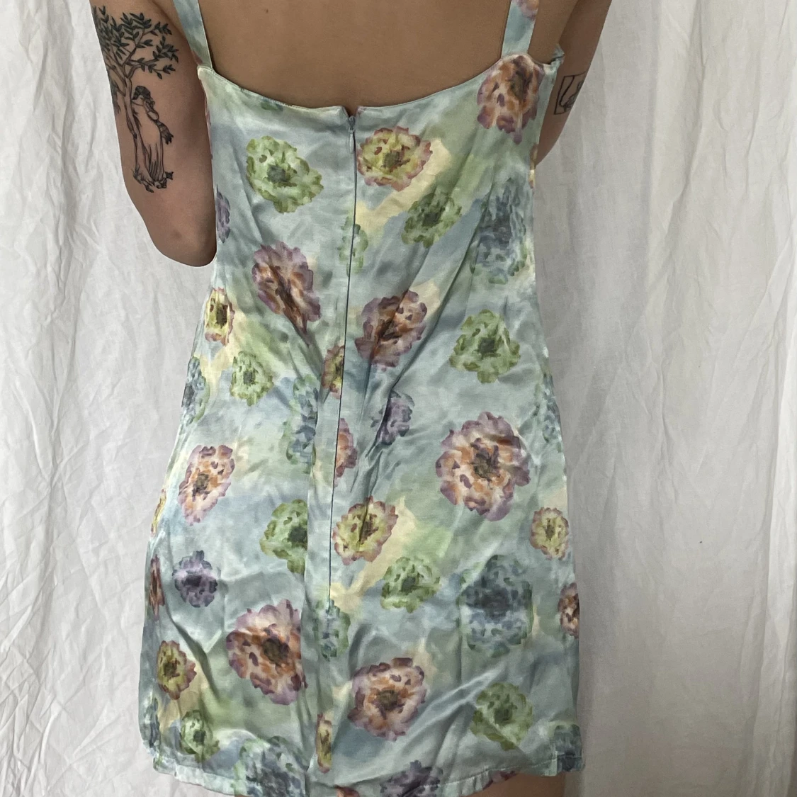 Väldigt söt satin klänning med blommor på. Lite stor där bak men fixat med litet snöre inuti klänning (kan alltid tas bort)