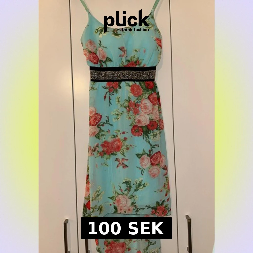 Snygg klänning i ljusblått med blommigt mönster i rosa, rött och grönt. Klänningen har smala axelband och ett svart midjeband dekorerat med pärlor. Materialet är lätt och luftigt, perfekt för varma dagar. Den har en flowy passform och är något längre bak.