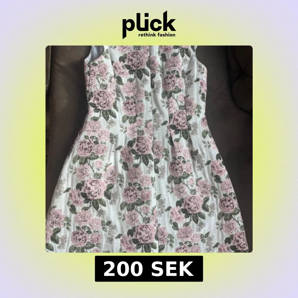 Säljer en vacker blommig klänning med v-ringning och ärmlös design. Klänningen har ett romantiskt mönster med rosa blommor och gröna blad på en vit bakgrund. Perfekt för sommarens alla tillfällen!