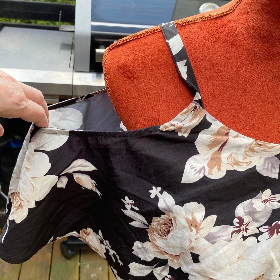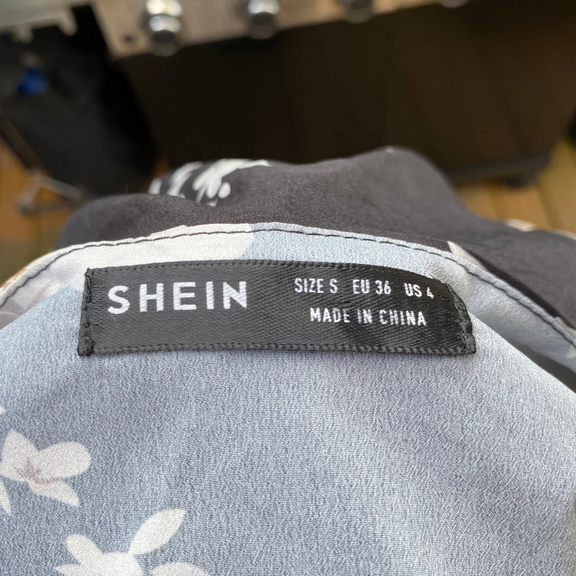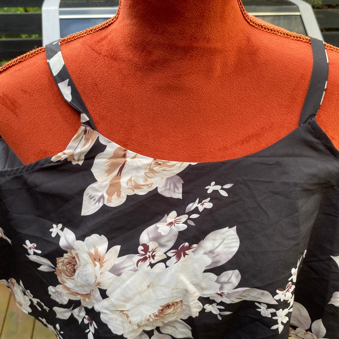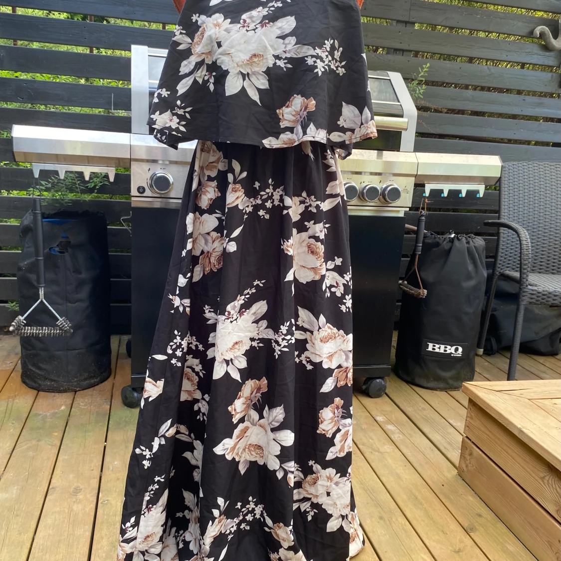 Svart blommig klänning med axelband och en kortare överdel som faller över bysten. Klänningen har ett blommönster i vita och bruna toner. L: 141 cm Bystvidd : 44 cm Inga bilder när den sitter på mig! Katter finns i hemmet!