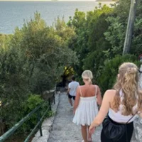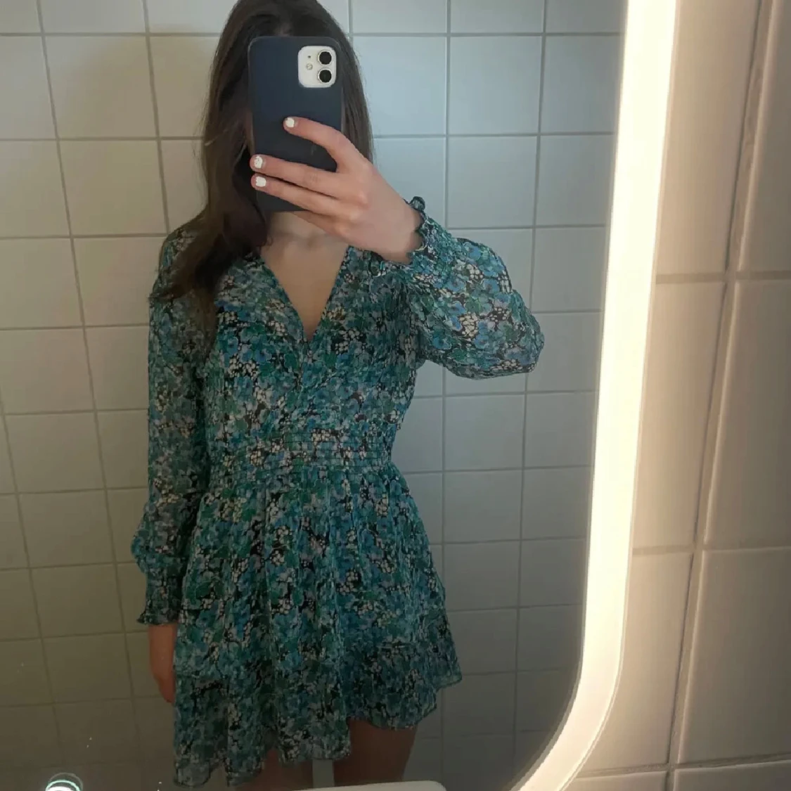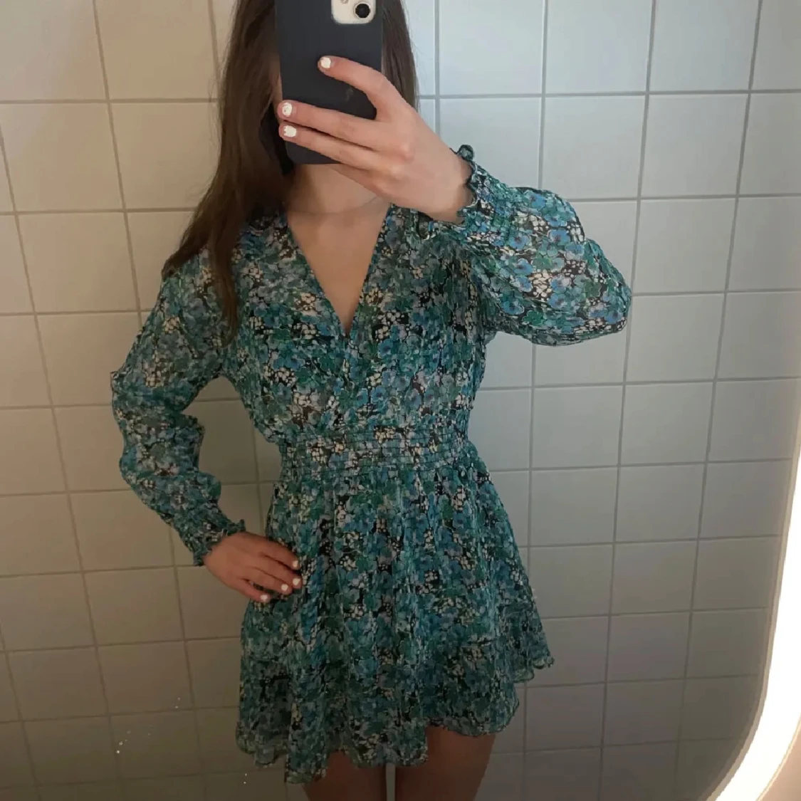 Supersöt kortklänning i blått/grönt med blommigt mönster och volangkant. Klänningen har v-ringning, långa ärmar med resår vid handlederna och markerad midja. Perfekt för sommaren och nu till midsommar💞💞