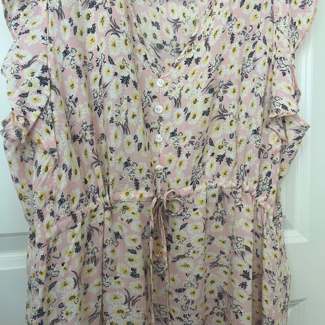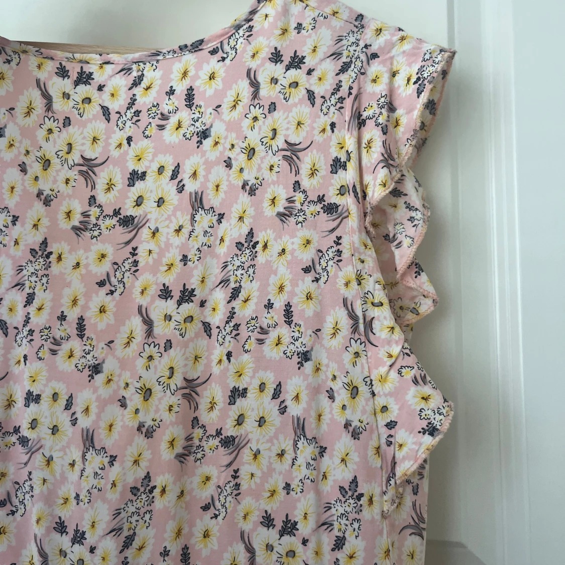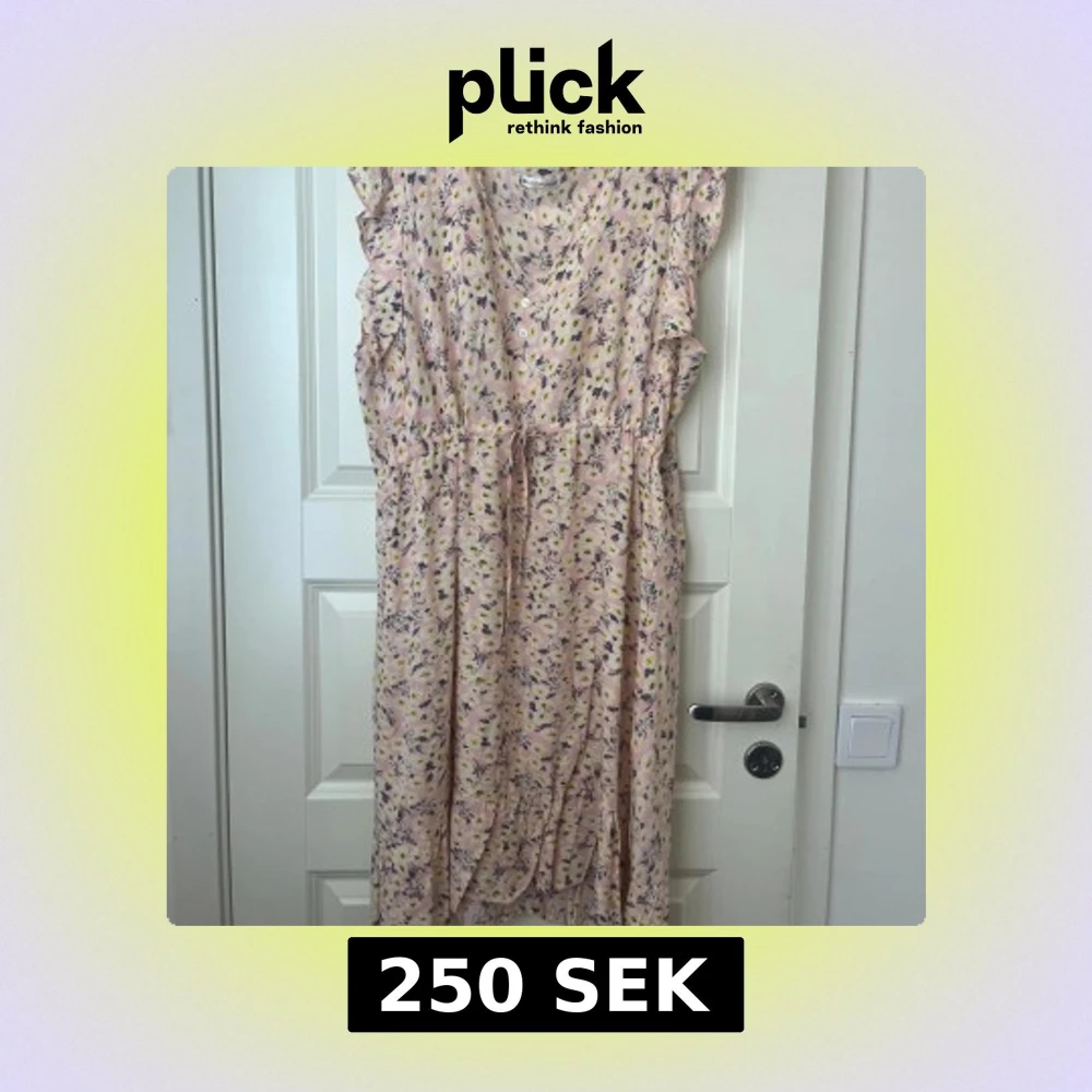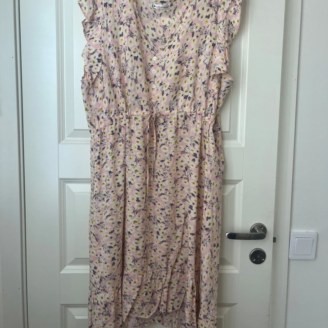Söt rosa klänning med blommigt mönster, volangdetaljer vid axlarna och knappar framtill. Klänningen har v-ringning, knytband i midjan och är ärmlös. Perfekt för varma dagar och somriga tillfällen.