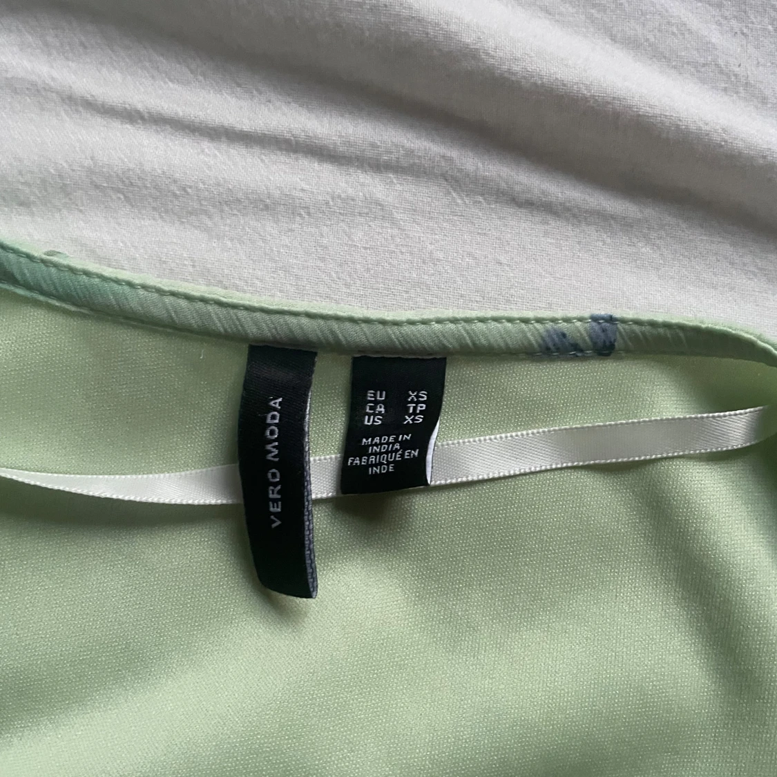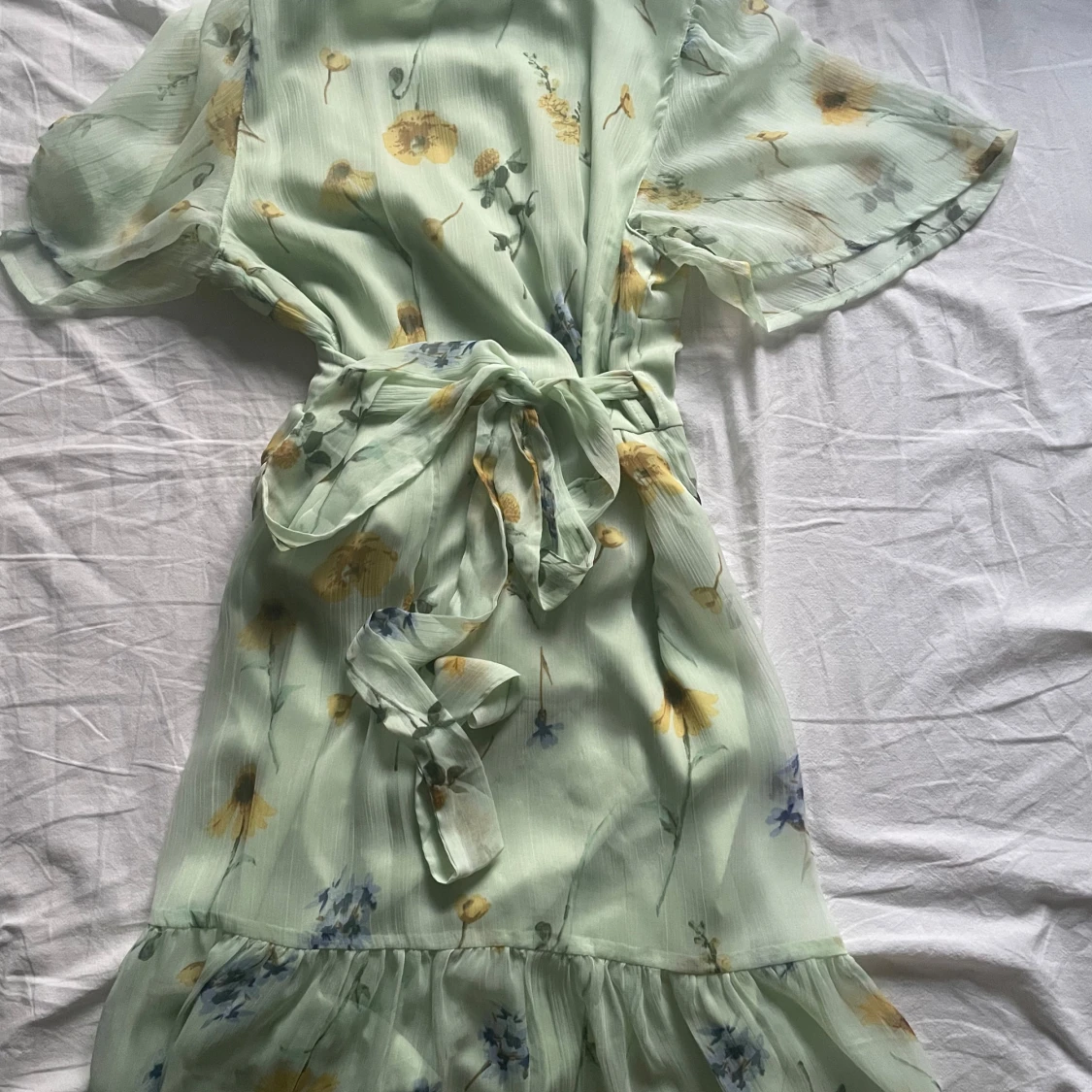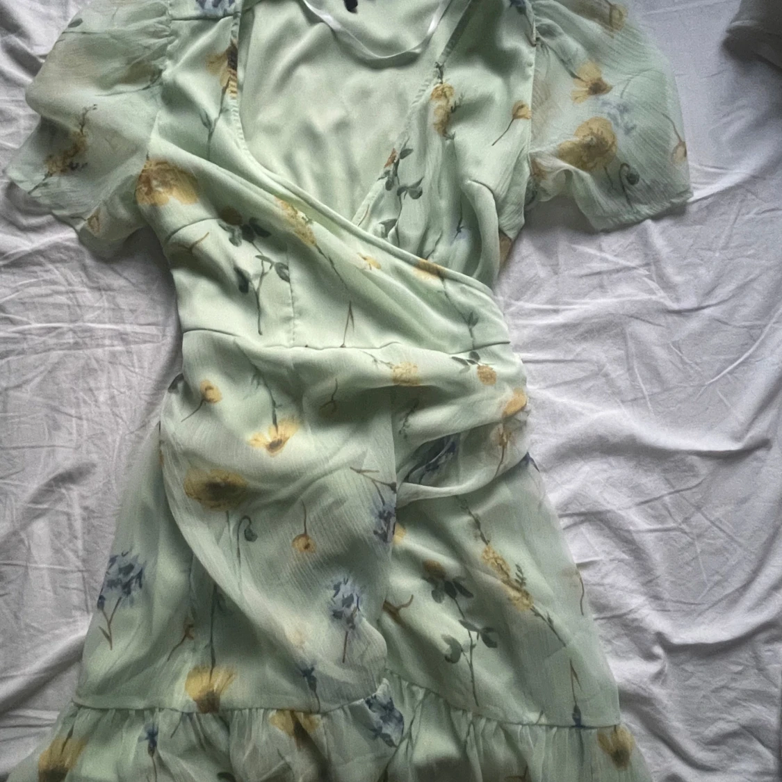 Superfin mintgrön kortklänning från Vero Moda med blommigt mönster i gult och blått. Omlottmodell med knyt i midjan, volang nertill och korta puffärmar. Perfekt för sommarens alla tillfällen!