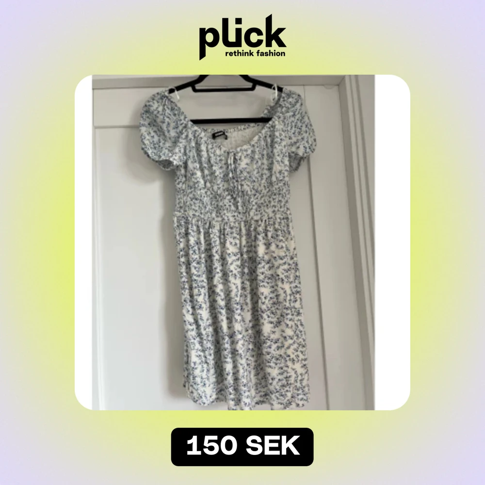 Somrig vit klänning med blåa blommor som mönster. Klänningen gör att ha som off shoulder eller med armarna upp. Endast använt vid 2 gånger