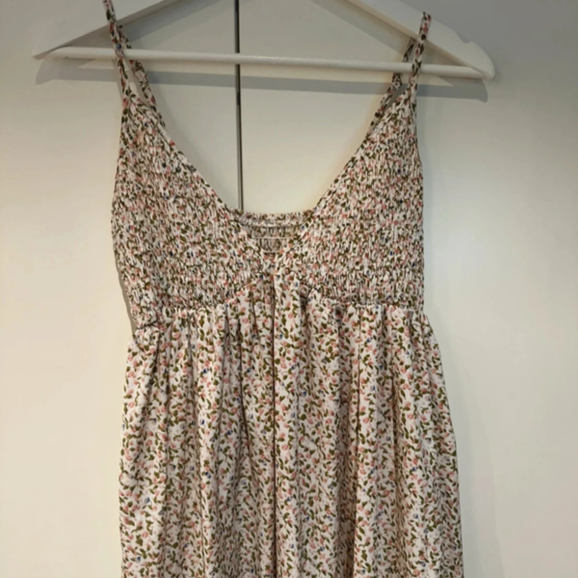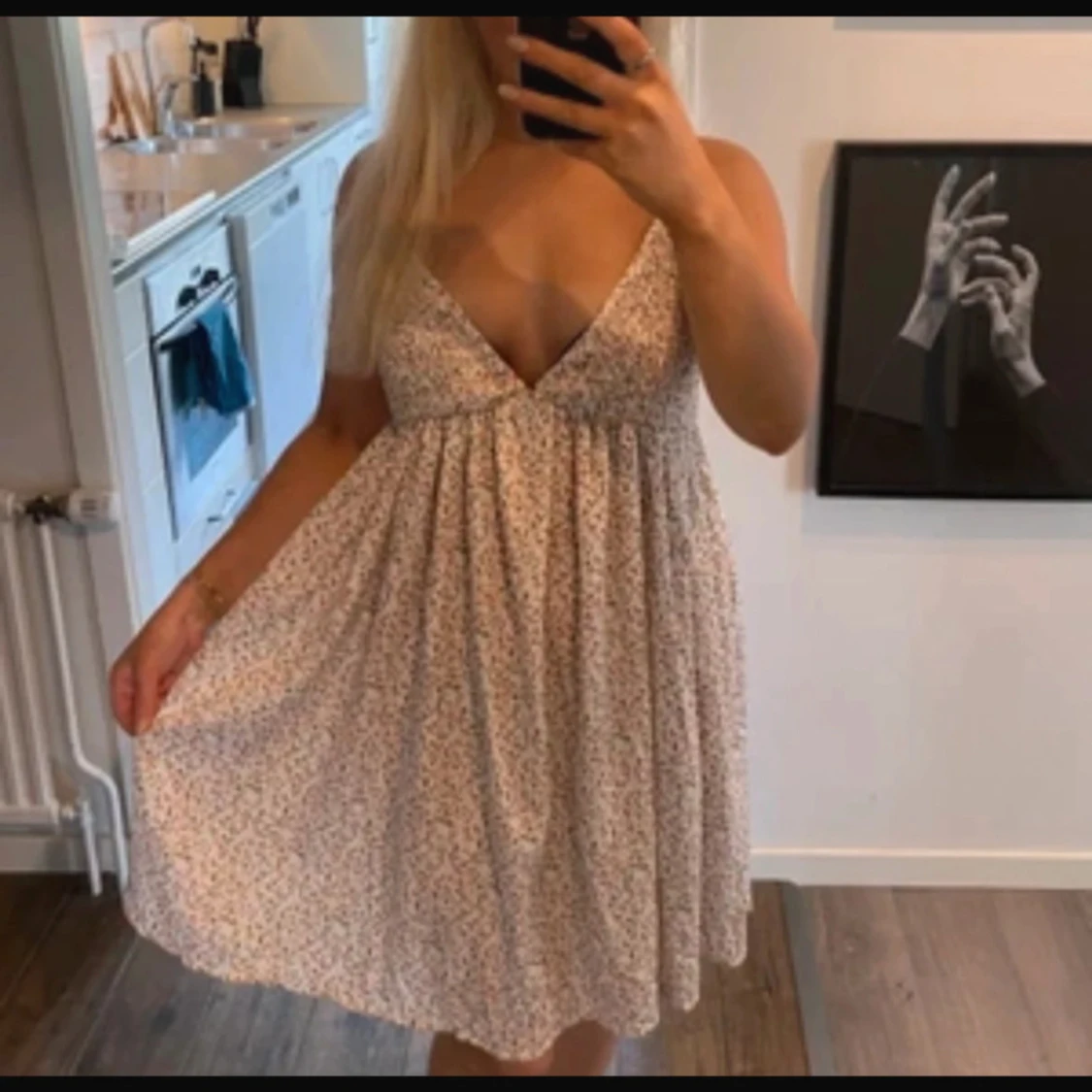 Supersöt kort klänning med blommigt mönster i ljusa färger. Djup v-ringning och smala axelband ger en luftig känsla. Perfekt för varma dagar, med flowy passform och mjukt bomullstyg. Lätt att styla med sneakers eller sandaler.