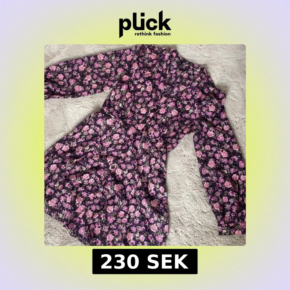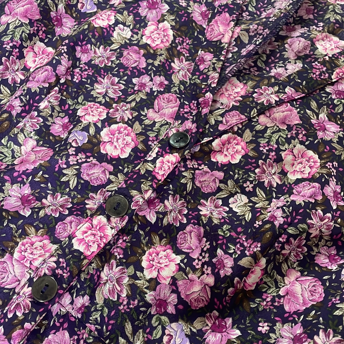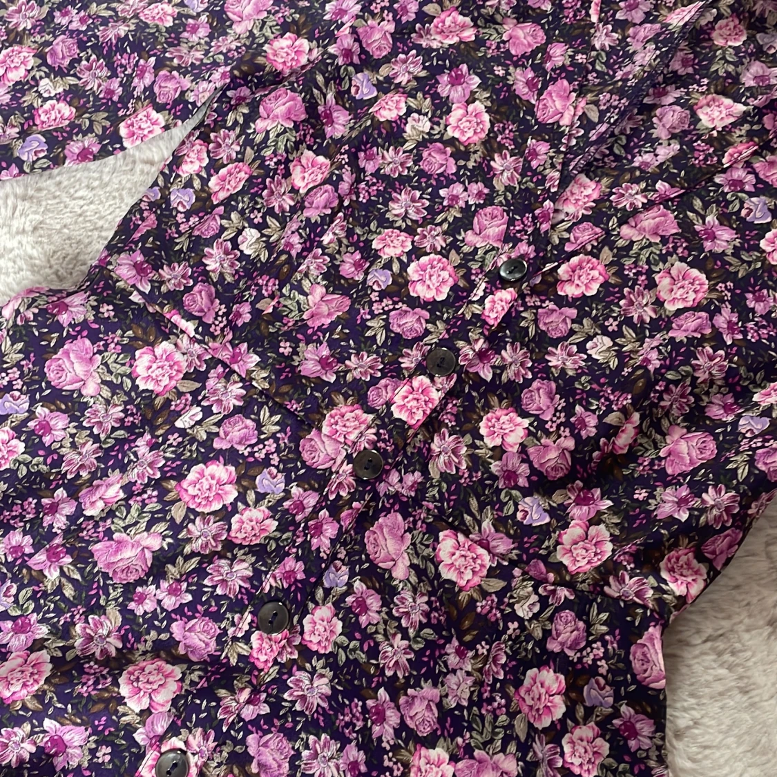 Supersöt kortklänning med lila och rosa blommor på mörk botten. Klänningen har långa ärmar, markerad midja (insydd) och knappar framtill.