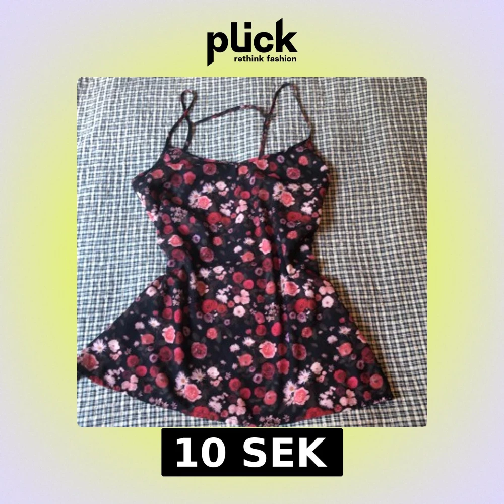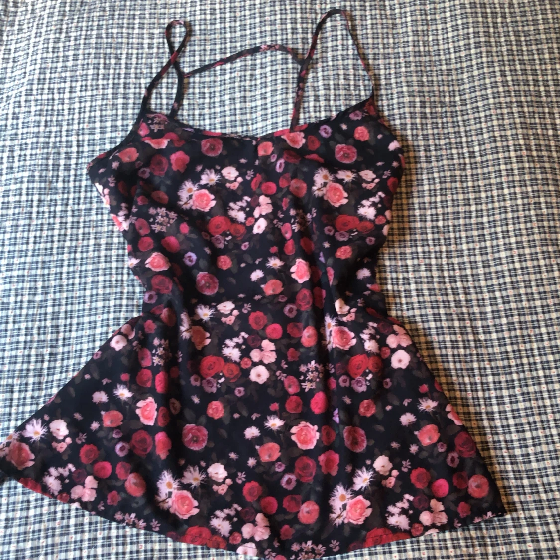 Supersöt kortklänning med svarta och röda toner, täckt av blommigt mönster. Klänningen har smala axelband och lätt utställd kjol, perfekt för varma dagar. Materialet känns lätt och luftigt, och färgerna poppar verkligen.