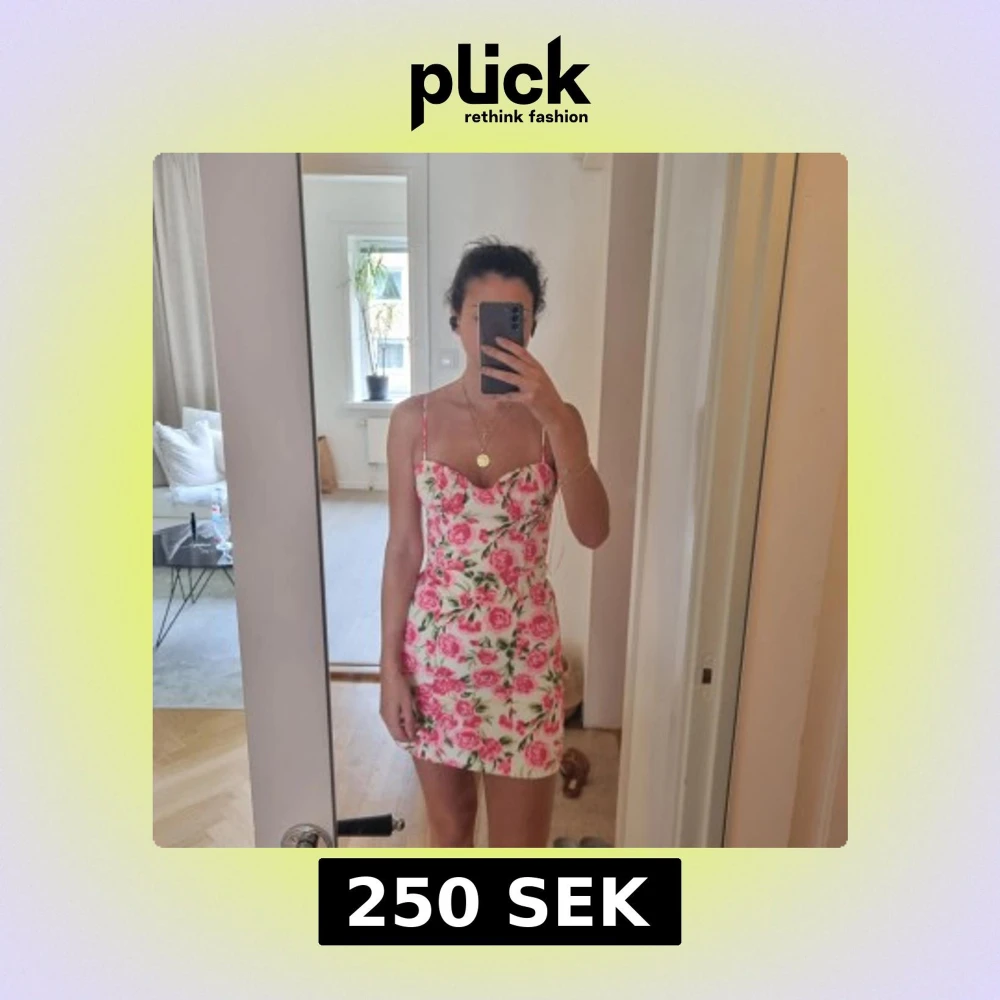 Säljer en söt kortklänning med blommigt mönster i rosa och grönt på vit bakgrund. Klänningen har smala axelband och en figurnära passform, perfekt för sommarens varma dagar.