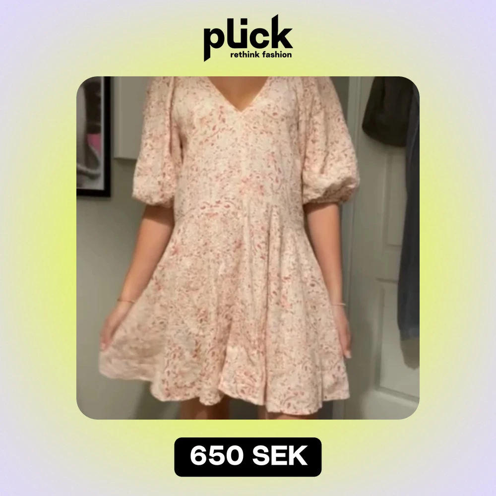 En vacker blommig kortklänning med puffärmar och v-ringad hals. Klänningen har en lös passform och är perfekt för sommarens festligheter.