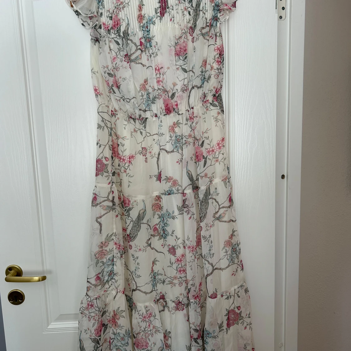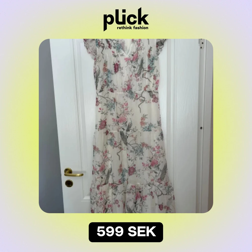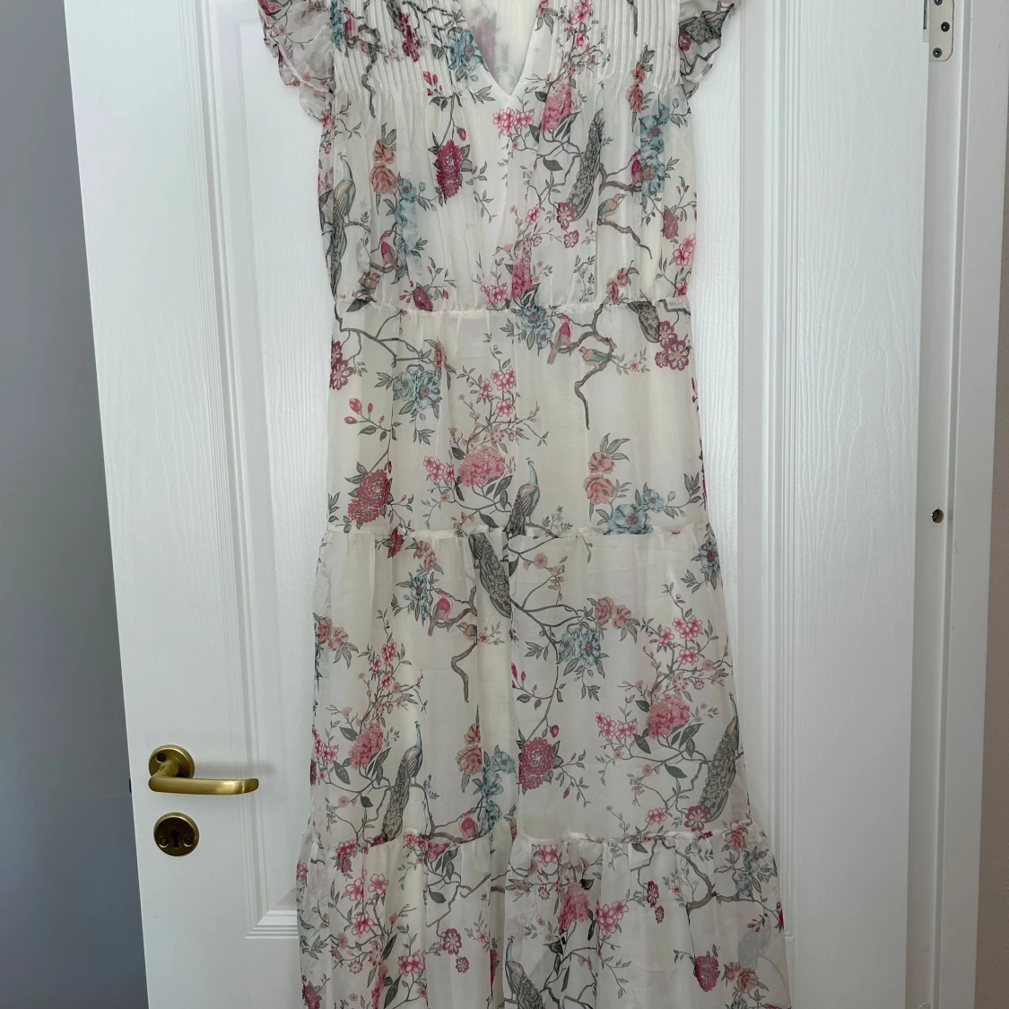 Säljer en superfin blommig långklänning från Cellbes i storlek 34/36. Klänningen har en v-ringad hals och korta ärmar med volangdetaljer. Perfekt för sommarens fester eller en mysig midsommar. Den är i ett lätt och luftigt material, perfekt för varma dagar.