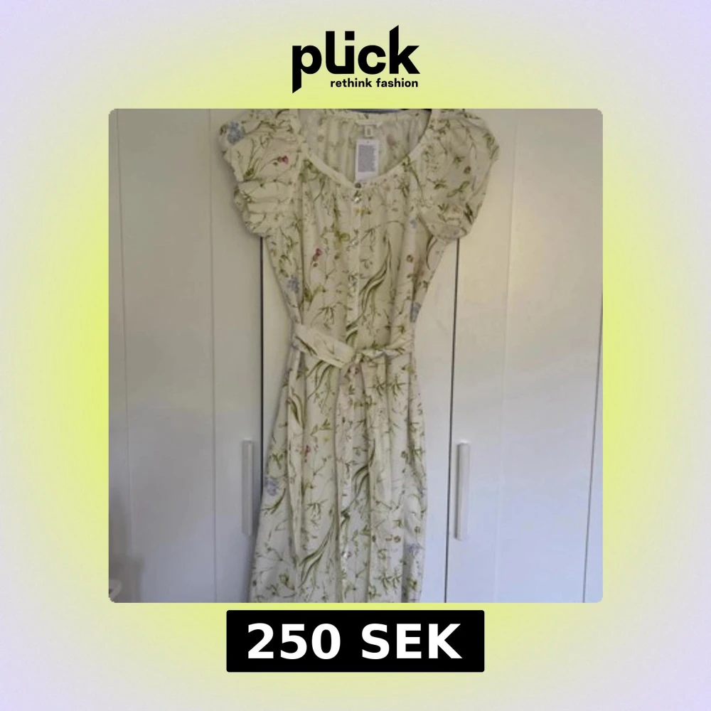 Superfin långklänning från H&M i ljusbeige med blommigt mönster i grönt, lila och rosa. Klänningen har korta puffärmar, knappar framtill och ett matchande knytbälte i midjan. Perfekt för sommarens alla tillfällen!