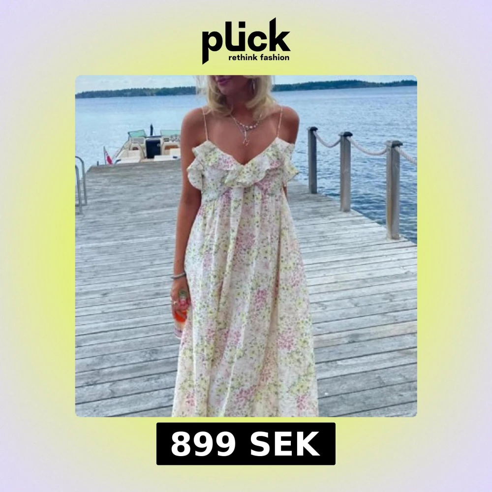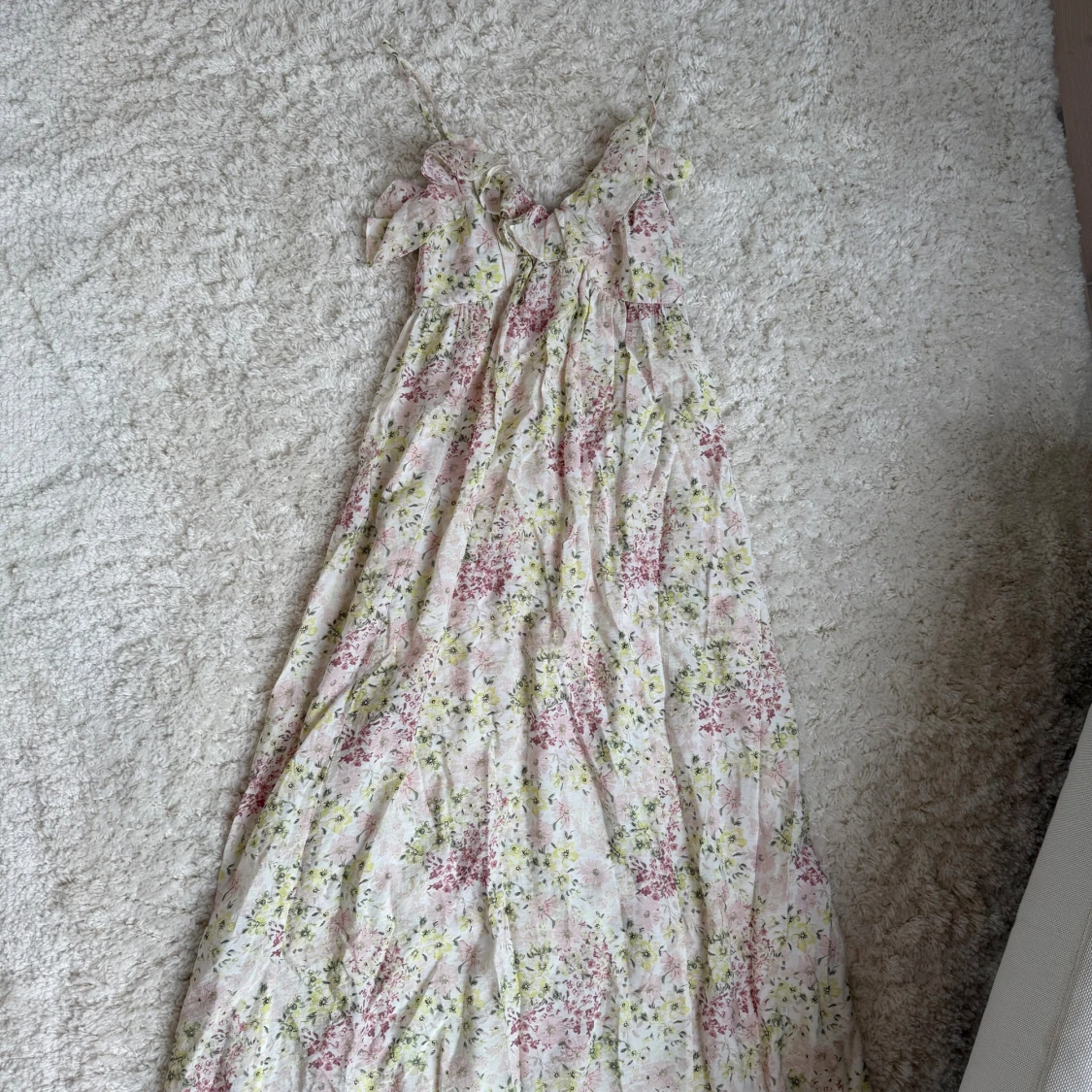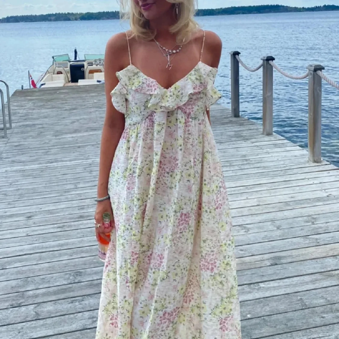 Superfin och trendig långklänning från H&M med tunna axelband och volangdetalj vid bysten.