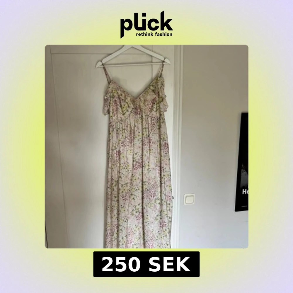 Romantisk långklänning från H&M med tunna axelband och volangdetaljer vid bysten. Klänningen har ett ljust blommigt mönster i rosa, gult och grönt på vit botten. Perfekt för sommarens alla tillfällen och ger en riktigt dreamy vibe.