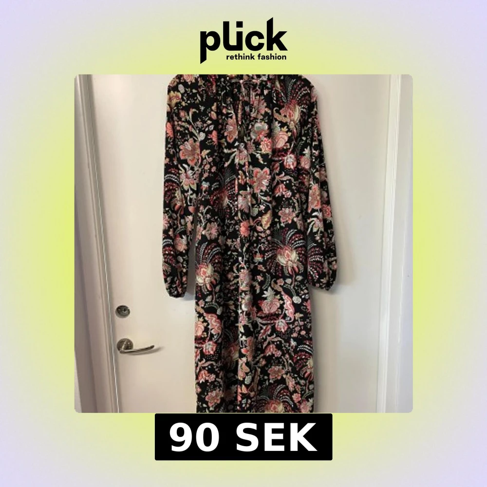 Säljer en svart långklänning från H&M med färgglatt blommönster i rosa, beige och grönt. Klänningen har lång ärm och hög hals med knytning. Perfekt för dig som gillar bohemisk stil och vill sticka ut.