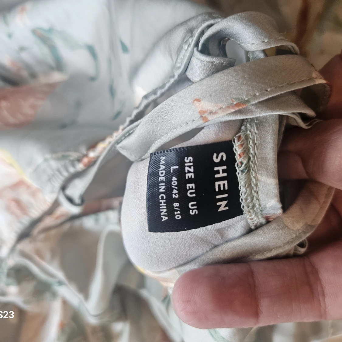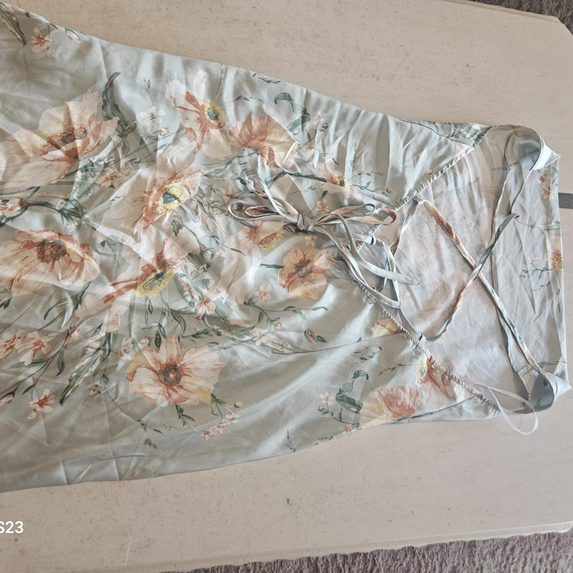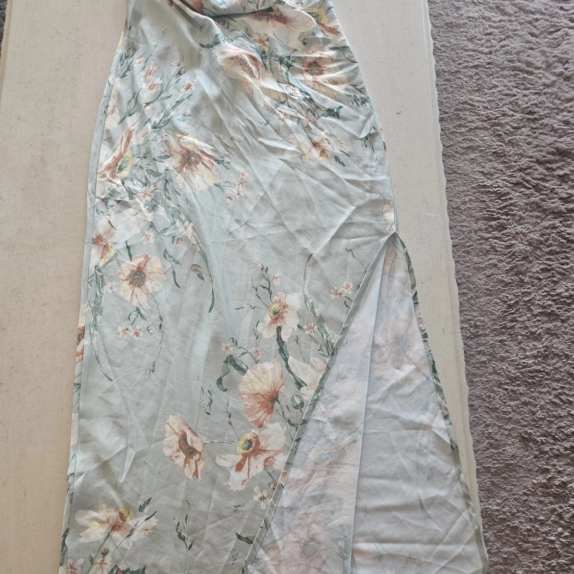 Superfin långklänning från SHEIN i ljus pastellgrön ton med blommigt mönster. Klänningen har snörning i ryggen, slits på sidan och tunna axelband. Perfekt för sommarens alla tillfällen och ger en romantisk vibe.