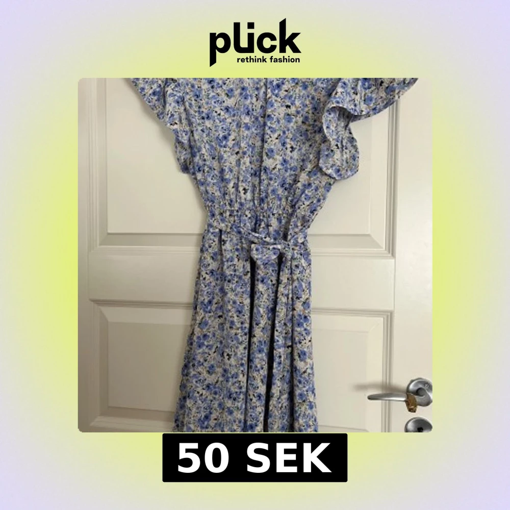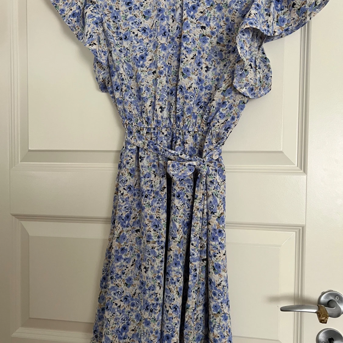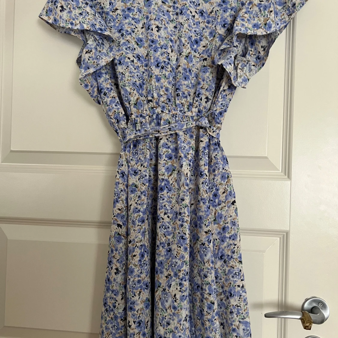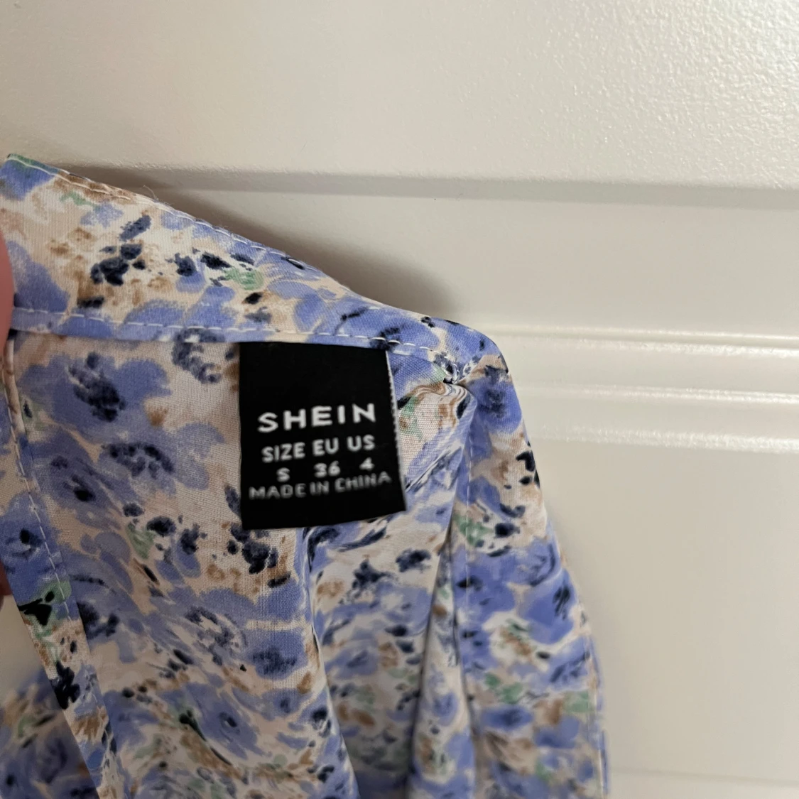 Långklänning från SHEIN med blått och vitt blommönster, volangärmar och knytskärp i midjan. Lätt och flowy modell, perfekt för varma dagar. Snygg v-ringning och avslappnad passform som ger en romantisk vibe.
