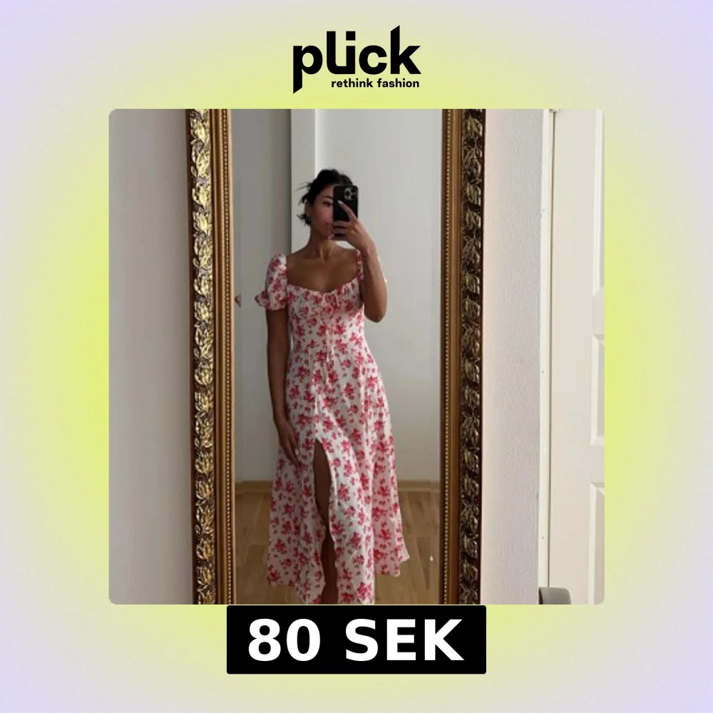 Superfin långklänning från SHEIN med puffärmar och rödblommigt mönster på vit botten.