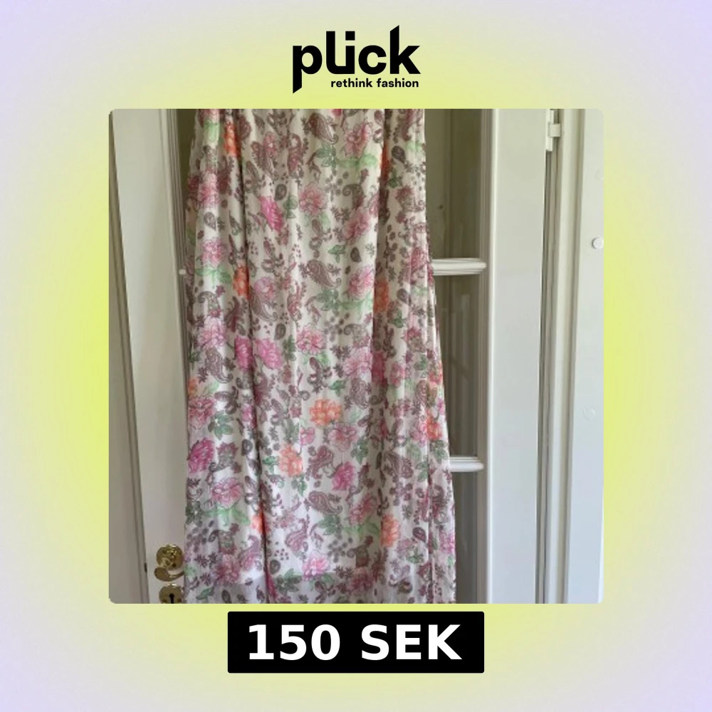 Säljer en långklänning med blommigt mönster i rosa, orange och grönt på vit botten. Klänningen har en luftig passform och är perfekt för varma dagar. Materialet är mjuk bomull och modellen är ärmlös.
