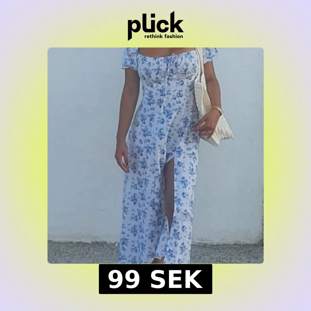 Säljer en superfin långklänning med blått blommigt mönster på vit botten. Klänningen har korta puffärmar, snörning vid bysten och en snygg slits framtill. Perfekt för varma dagar och ger en romantisk vibe.