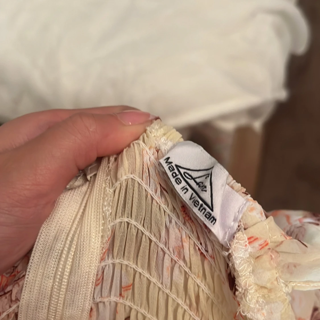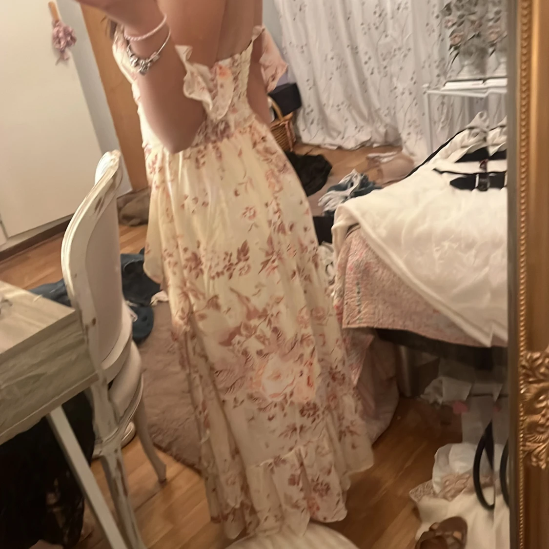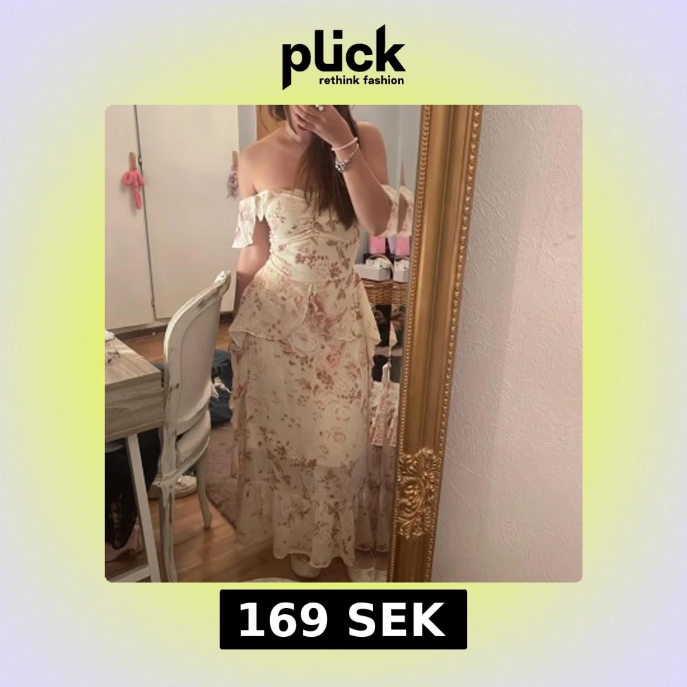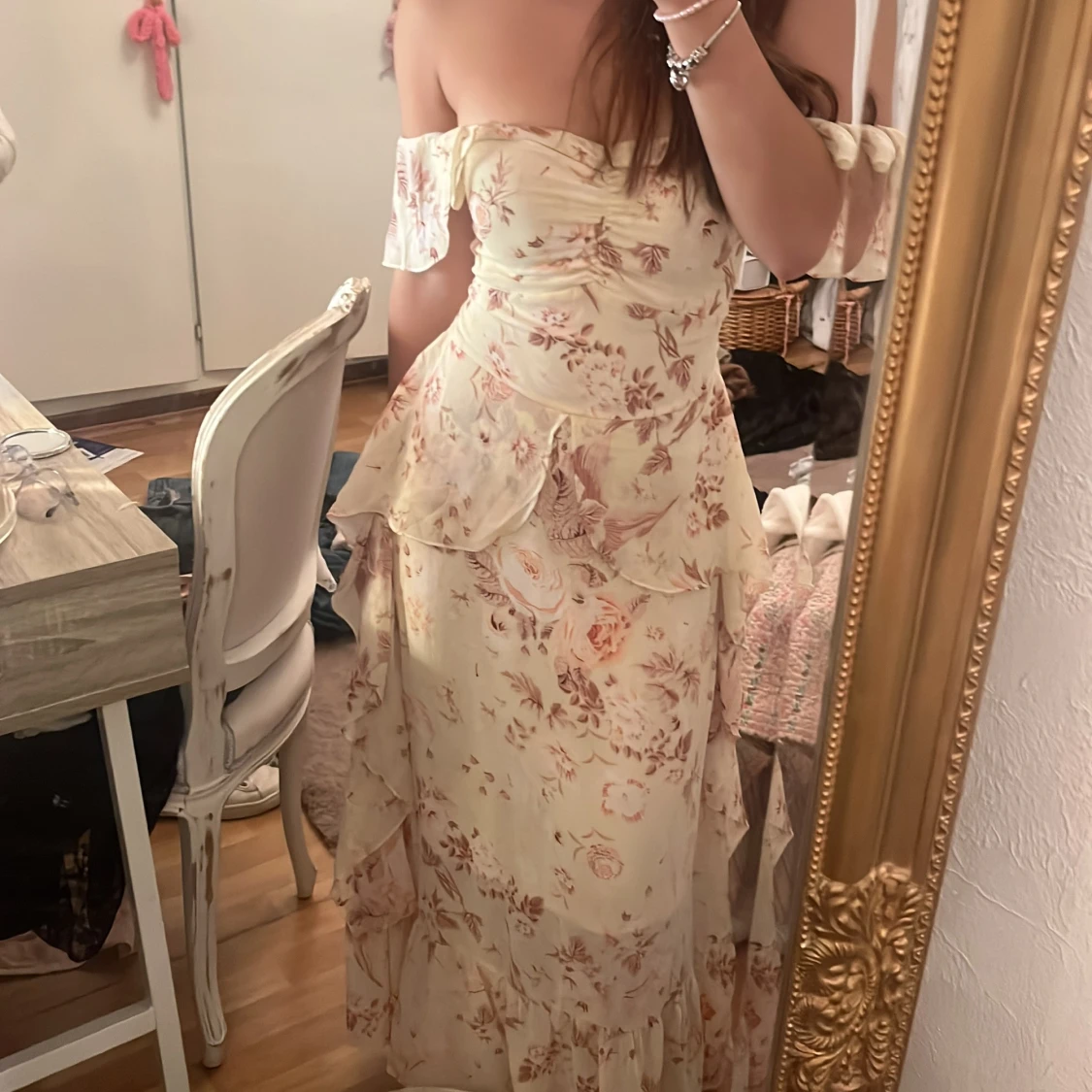 Romantisk offshoulder långklänning från LAM med volangdetaljer och blommigt mönster i ljusa toner av beige och rosa. Klänningen har axelbandslös design, omlottliknande överdel och mjukt, luftigt material som ger en flowy känsla. Perfekt för sommarens alla tillfällen.