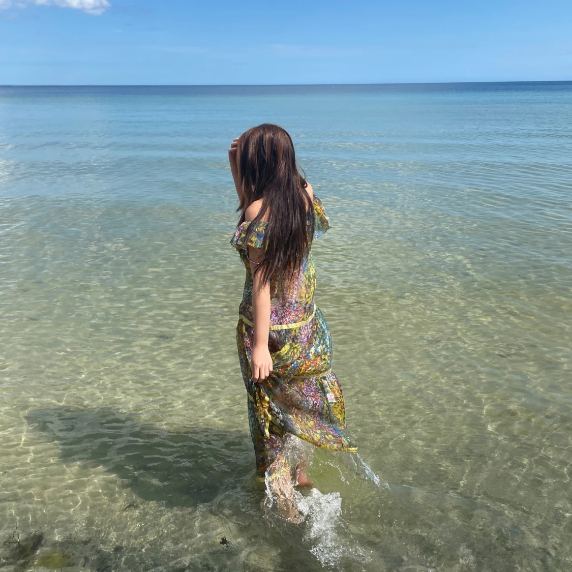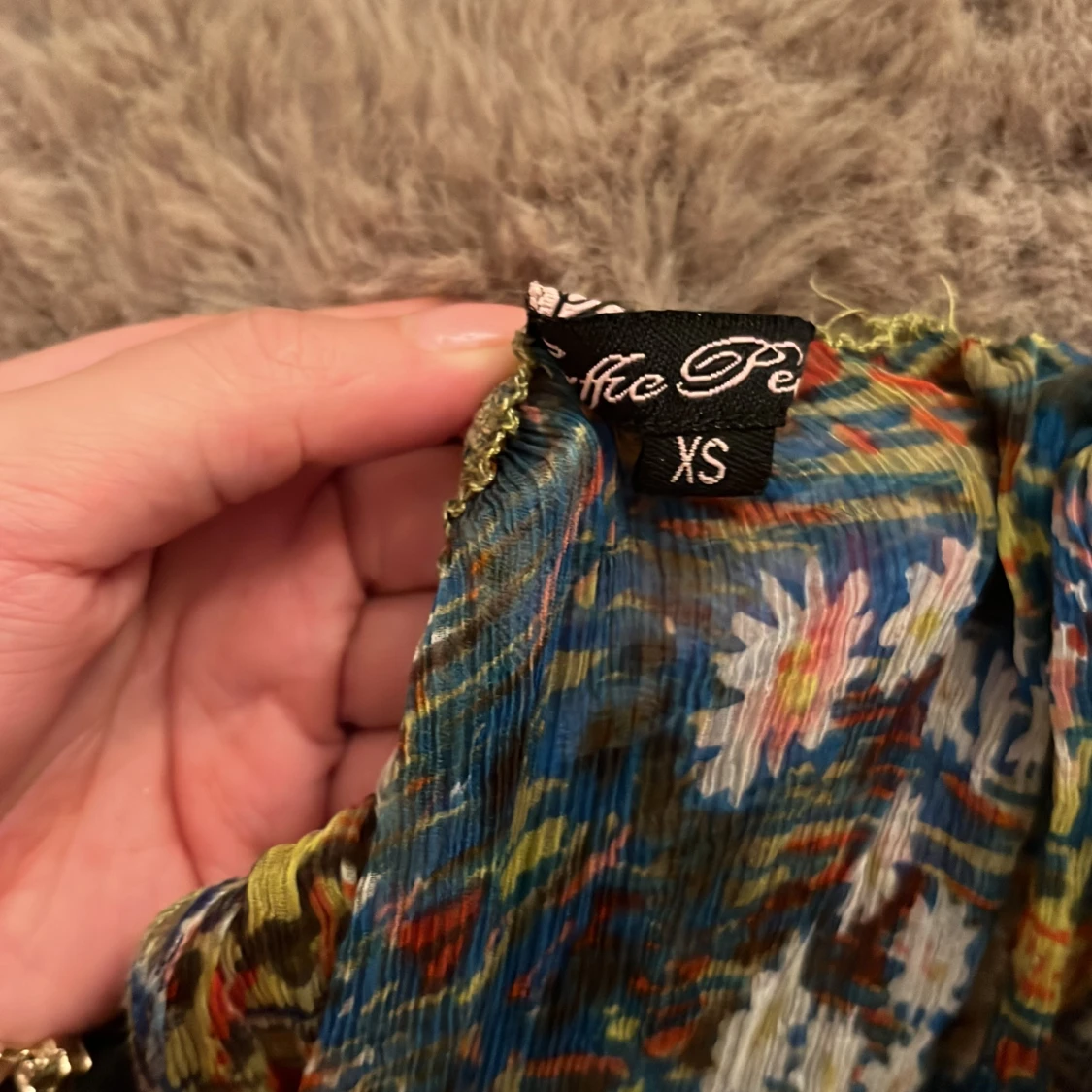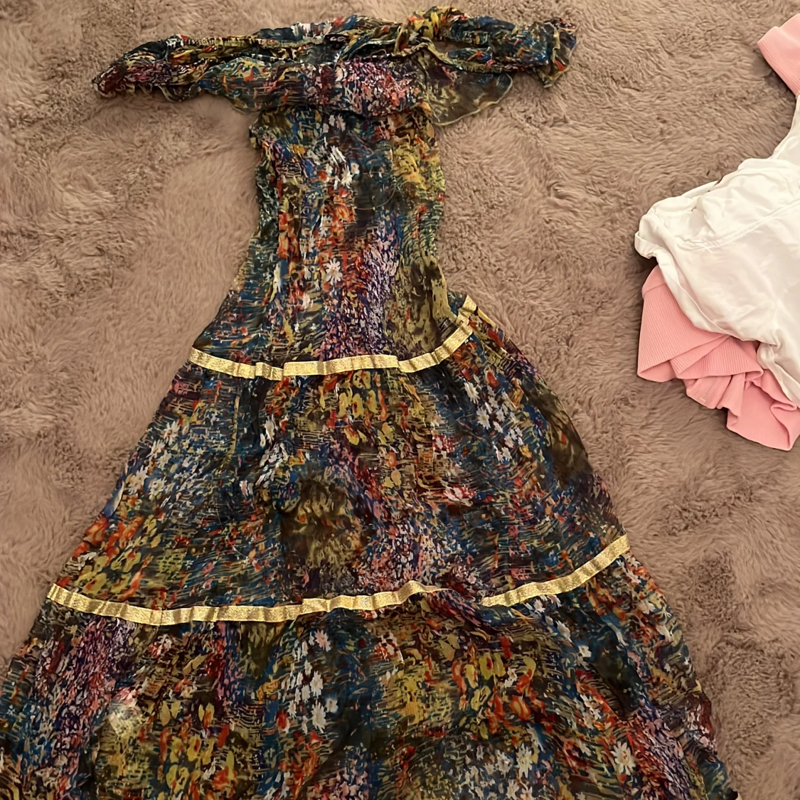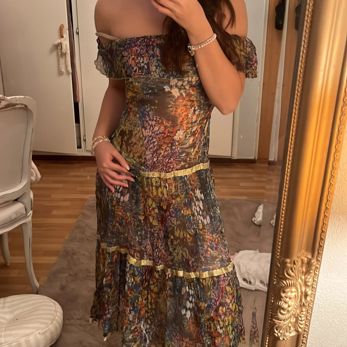 Superfin långklänning från The Perfect i storlek XS. Klänningen har offshoulder-modell, volangdetaljer och ett färgstarkt blommigt mönster i blått, grönt, gult och orange. Tunt, lätt material som känns luftigt och perfekt för varma dagar.