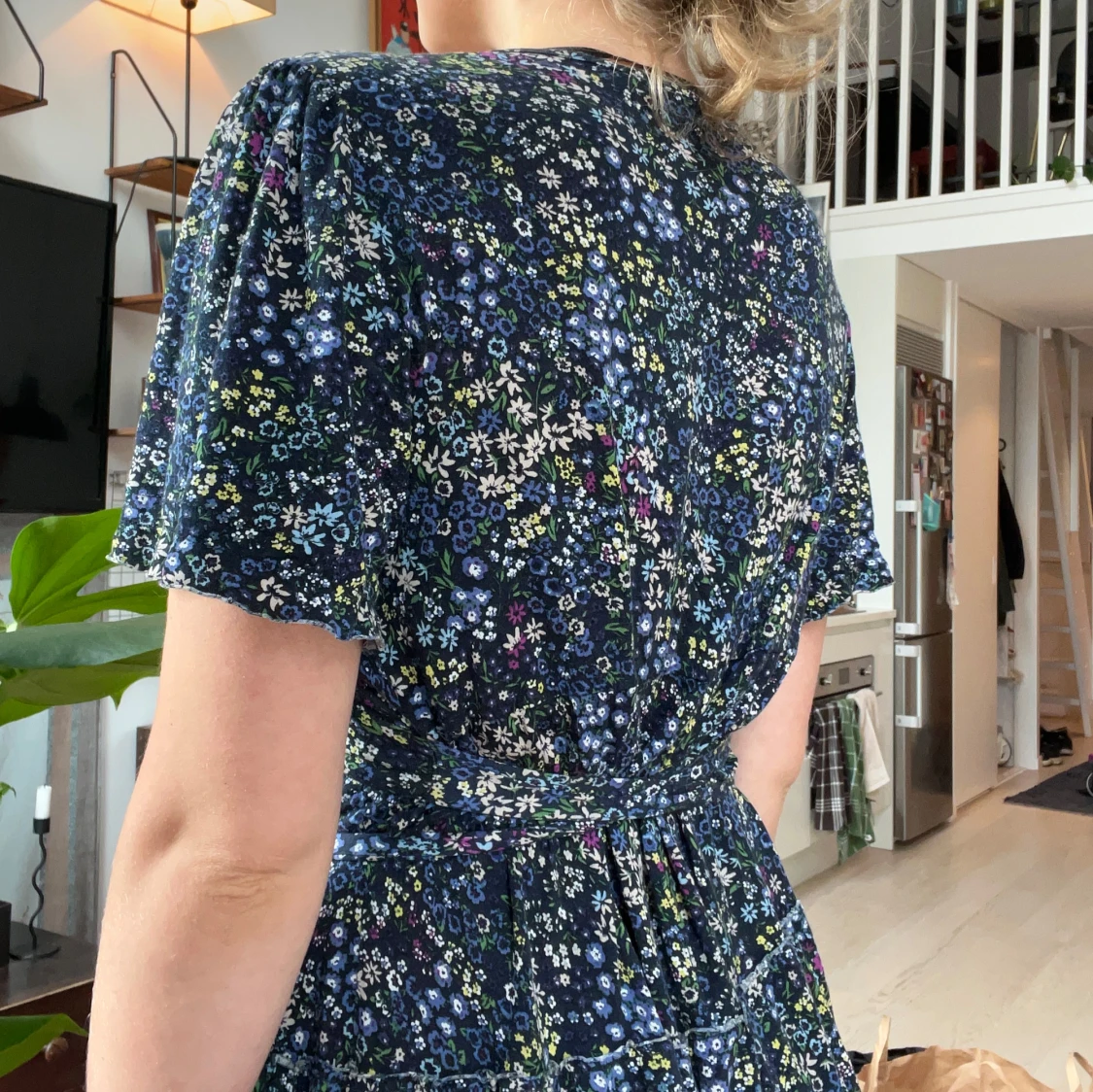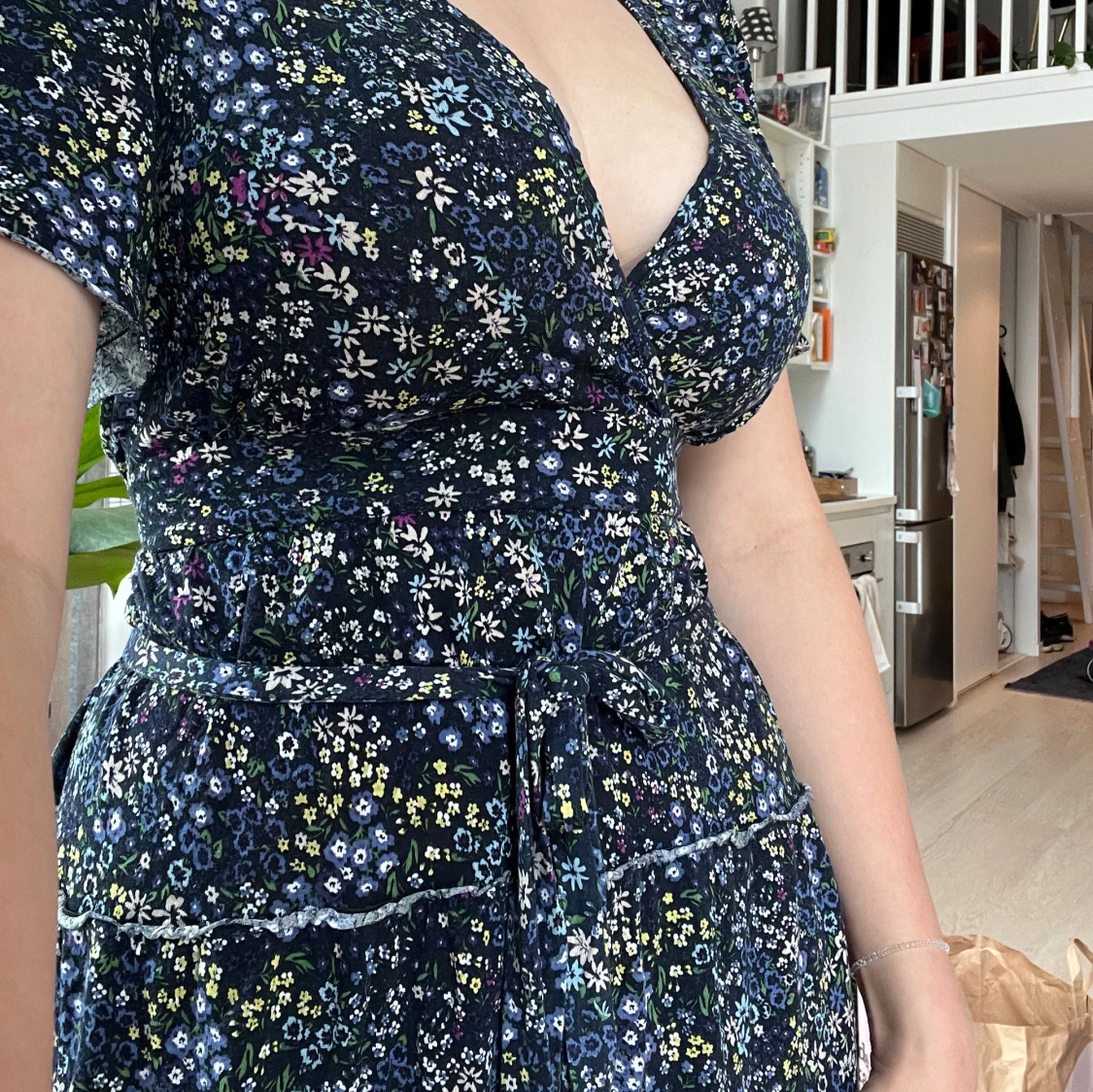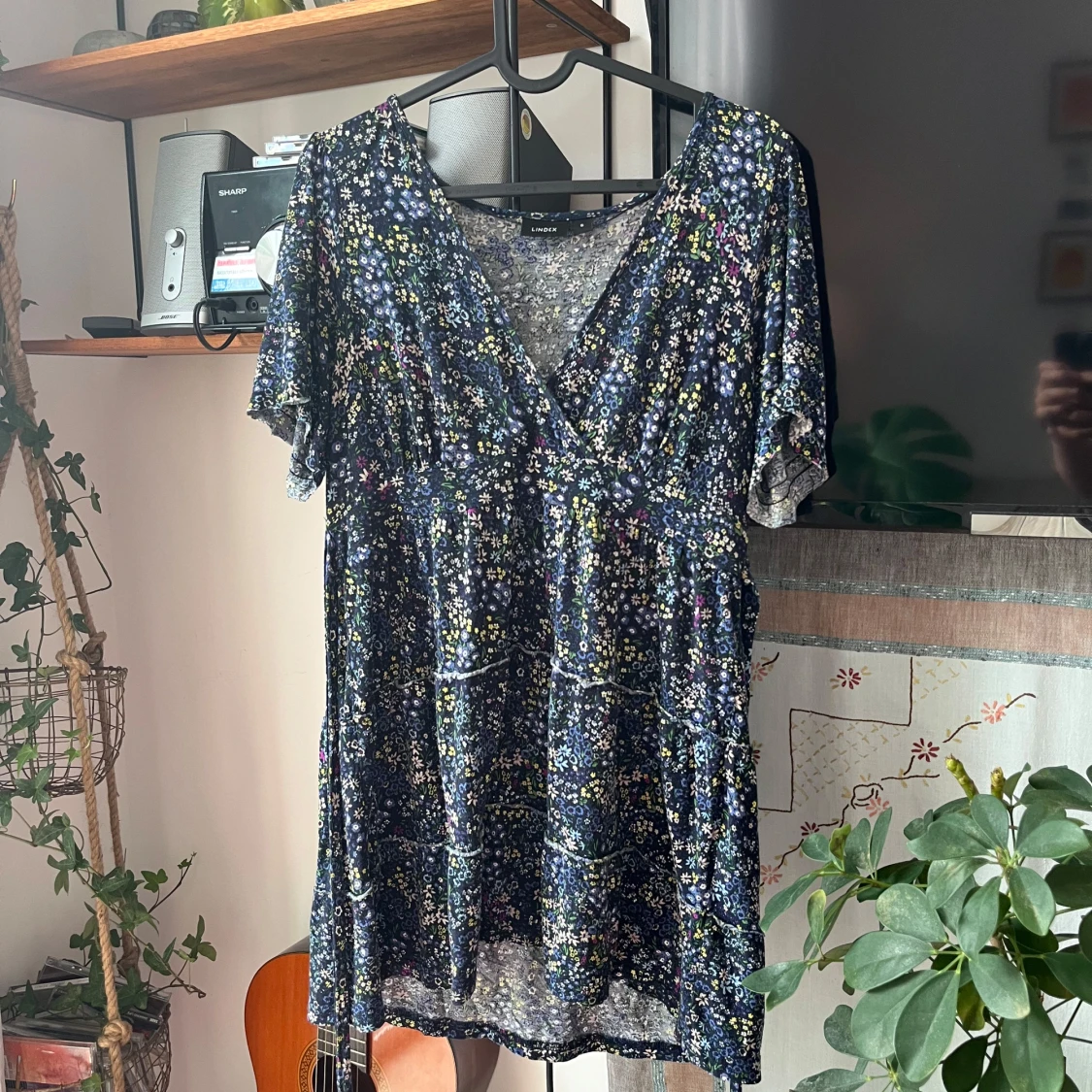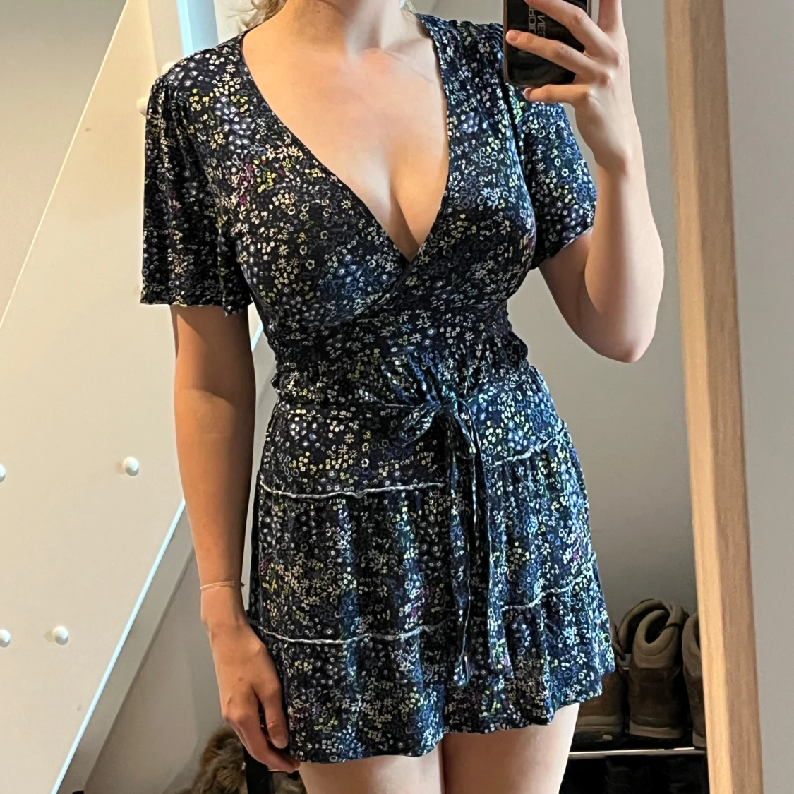 Supersöt kort omlottklänning från Lindex med mörkblå botten och små blommor i vitt, blått och gult. Klänningen har v-ringning, knyt i midjan och korta ärmar.