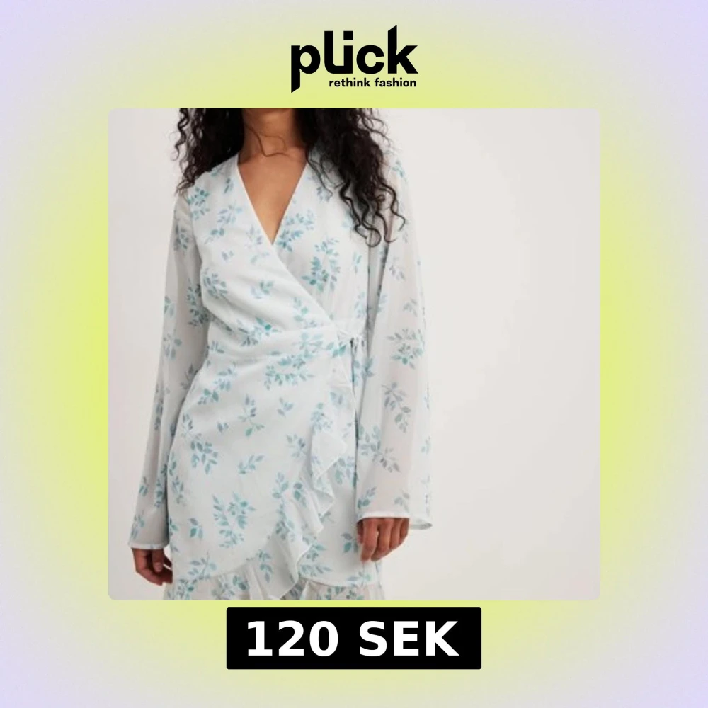Superfin kort omlottklänning med blommigt mönster i ljusblå färg. Klänningen har långa ärmar, v-ringning och volangdetalj framtill. Perfekt för sommarens alla tillfällen.