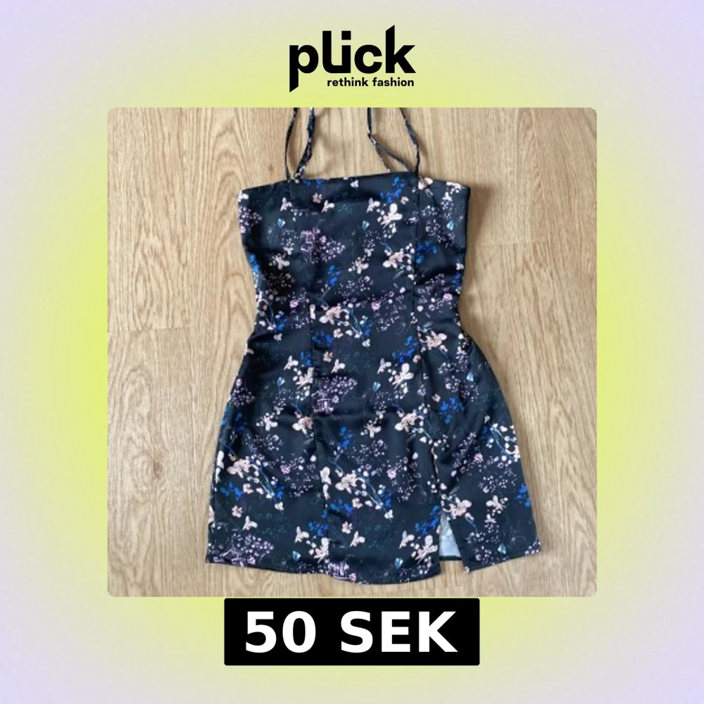 Supersöt kort klänning från Pull&Bear med smala axelband och svart botten. Storlek S men tycker att den passar mer som XS. Klänningen har ett blommigt mönster i rosa, blått och beige, samt en liten slits framtill. Sval och lätt, perfekt för varma dagar eller när du vill känna dig extra fin. OBS! Klänningen är justerad i midjan för att få en tajtare passform som syns på bild 4 & 5. Detta går att sprätta upp om så behövs.