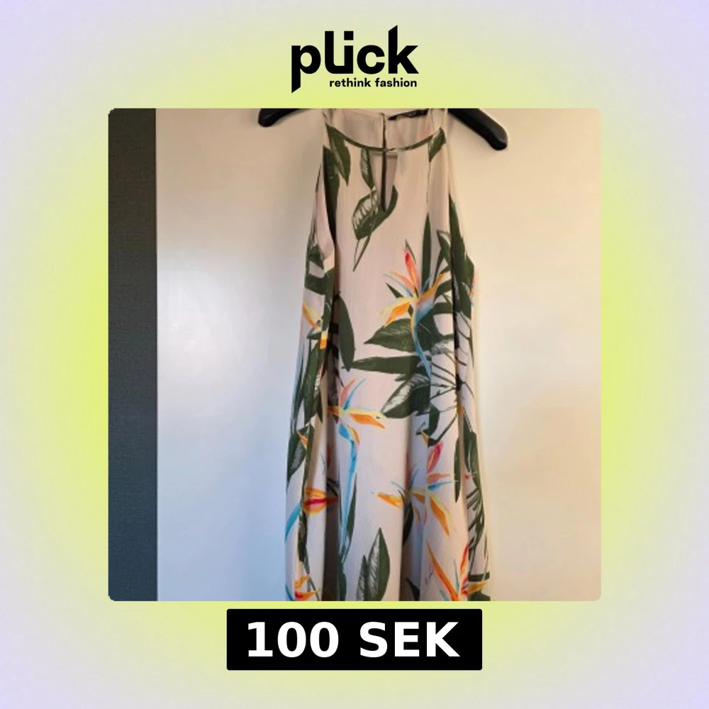 Säljer en ljus, ärmlös klänning från ONLY med tropiskt blommönster i grönt, gult, blått och orange. Klänningen har en rak, luftig passform och hög halsringning. Perfekt för varma dagar och ger en fräsch vibe med sitt färgglada tryck.