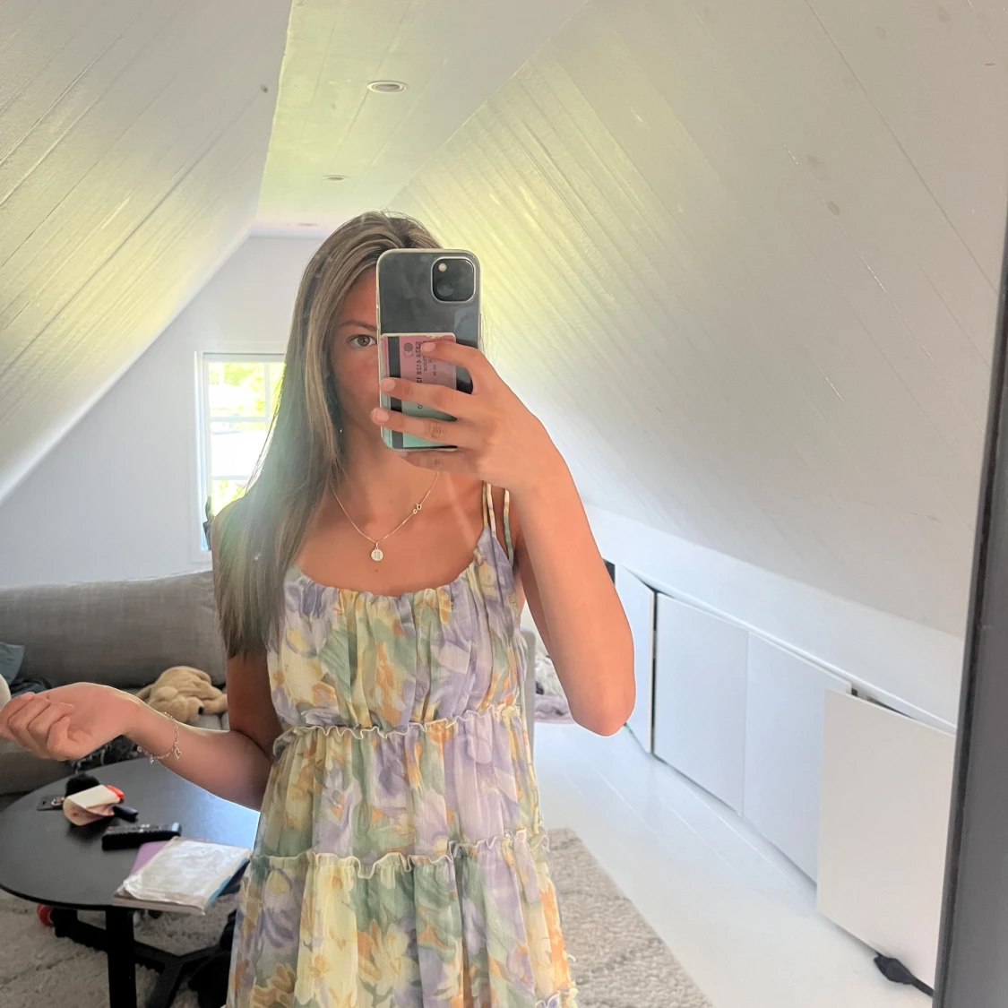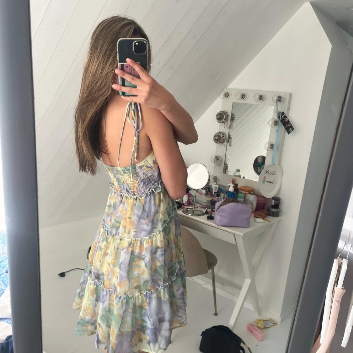 Supersöt kortklänning med blommigt pastellmönster i lila, gul och grön. Klänningen har tunna axelband som knyts, volanger i flera lager och smockad rygg. Perfekt för sommarens alla tillfällen och ger en riktigt fräsch vibe.