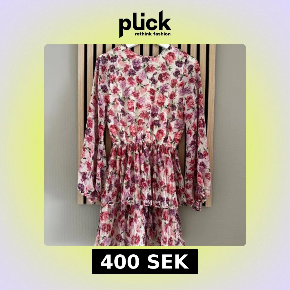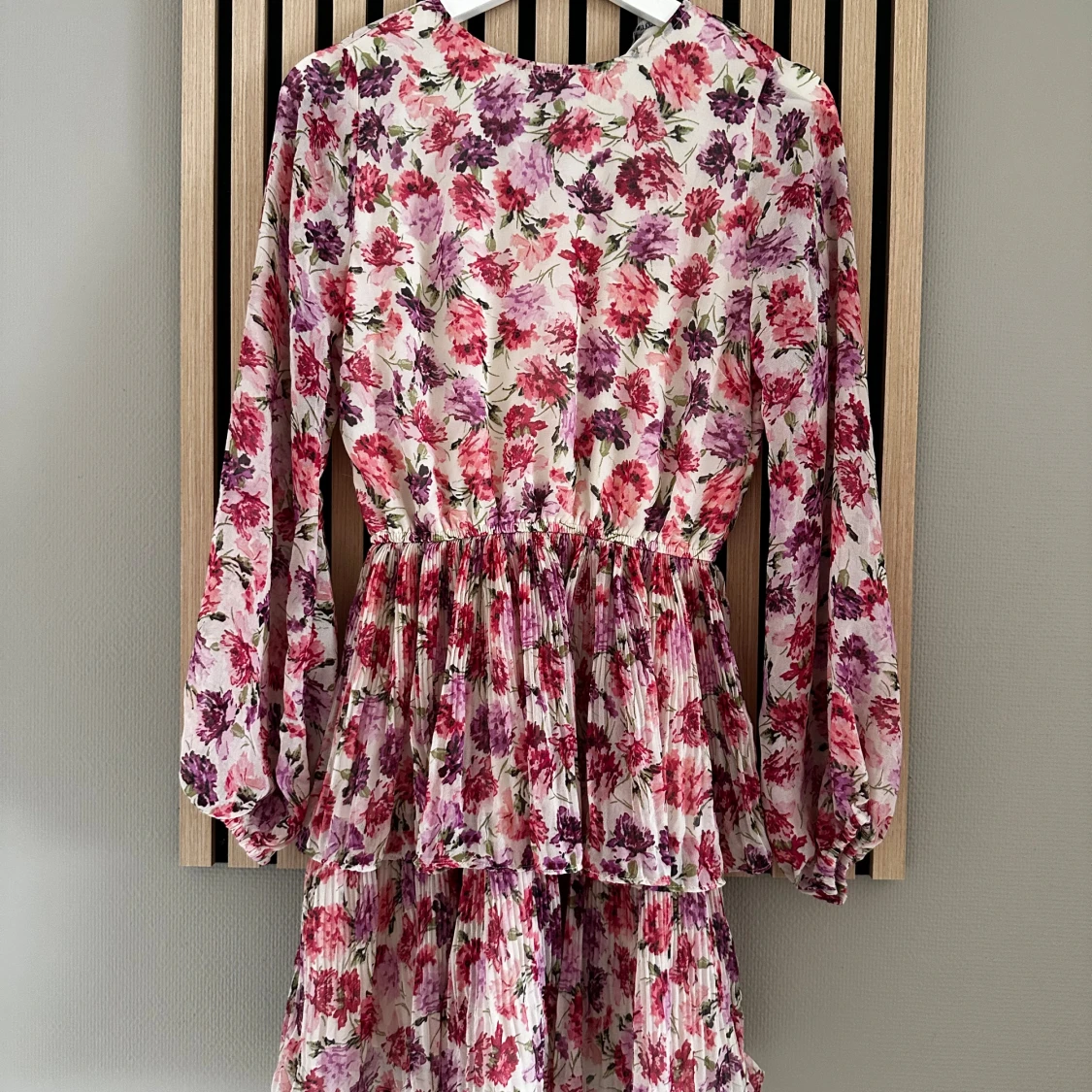 Supersöt kort blommig klänning med volanger och långa ärmar. Klänningen har ett mönster i rosa, lila och röda toner på vit botten, markerad midja och lätt rynkade detaljer. Superfin 💕 Mycket finare på än på bild! Endast testad, tyvärr lappen avdragen.