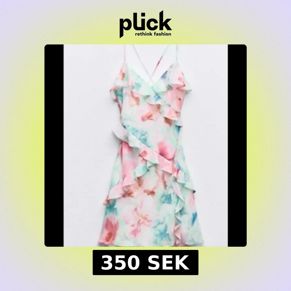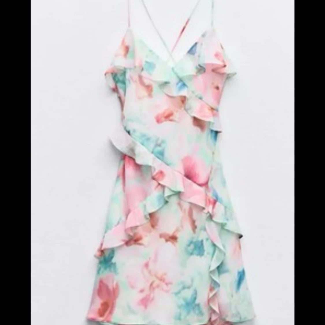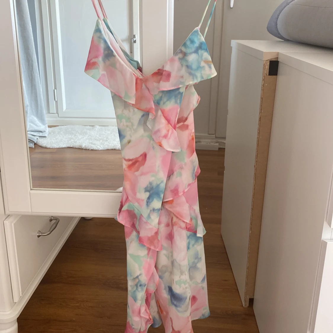 Superfin kort klänning med tunna axelband och volangdetaljer. Mönstret är blommigt i pastelliga färger som rosa, blått och grönt. Perfekt för sommarens alla tillfällen, lätt och luftig med romantisk vibe.