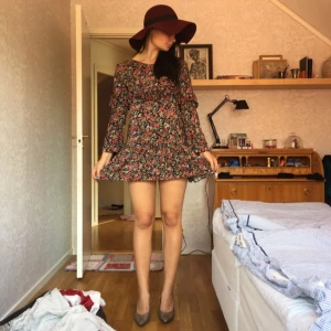 Jättefin blommig höstklänning med volangdetaljer. Den är köpt på Zara i Barcelona förra hösten. Använd några gånger men i fint skick, säljer pga att den är för kort för mig. Skulle säga att den sitter som en liten medium alt en stor small. På sista bilden kan ni se att gummibandet man knäpper knappen med har lossnat men det går lätt att fixa.